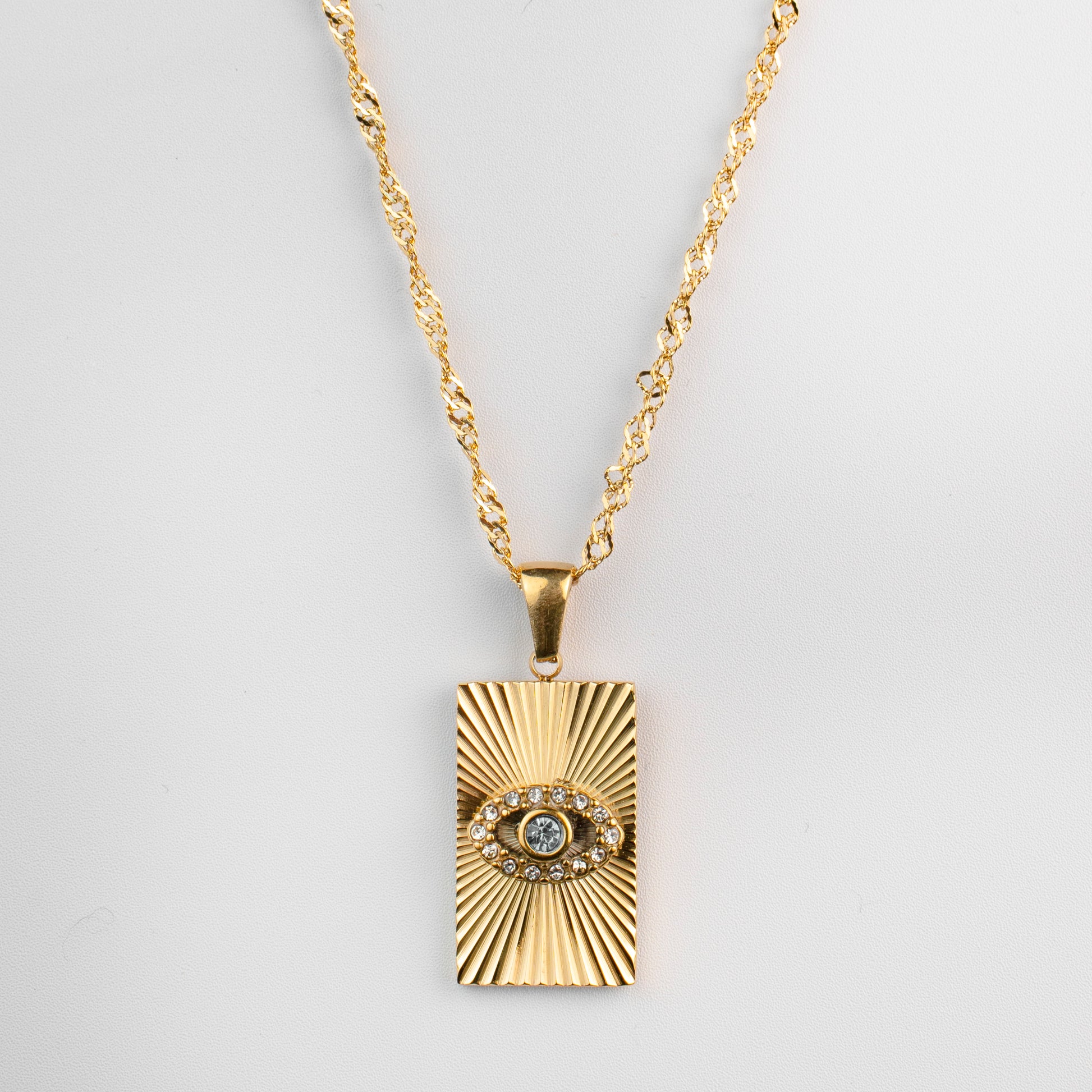 This gold-plated necklace exudes modern mysticism, featuring a rectangular pendant with a breathtaking sunburst design that radiates warmth and brilliance. At its heart sits a captivating blue gems...