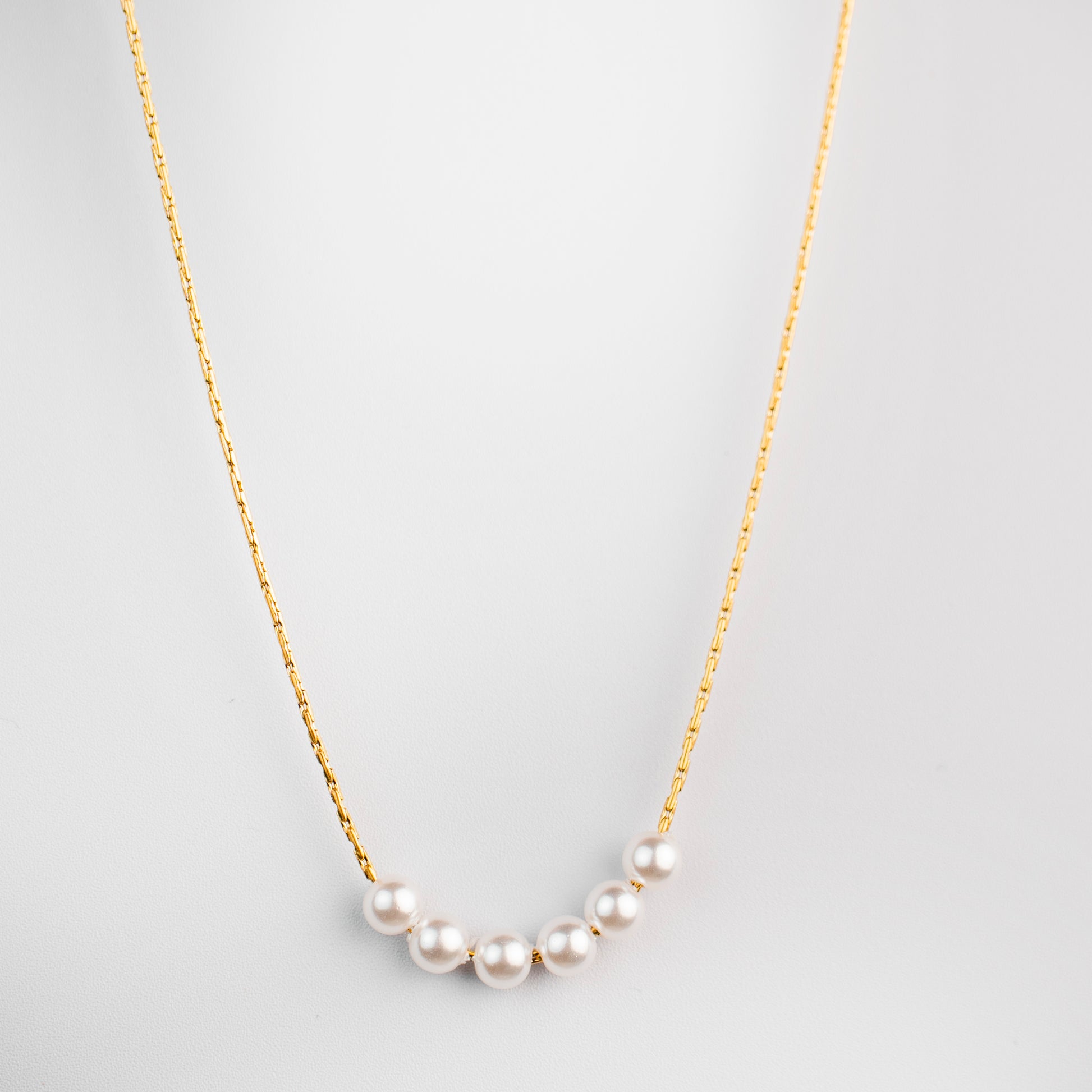 This necklace, featuring a delicate gold chain and six white pearls arranged in a graceful curve, embodies understated elegance. This necklace holds a unique balance of modern refinement and tradit...