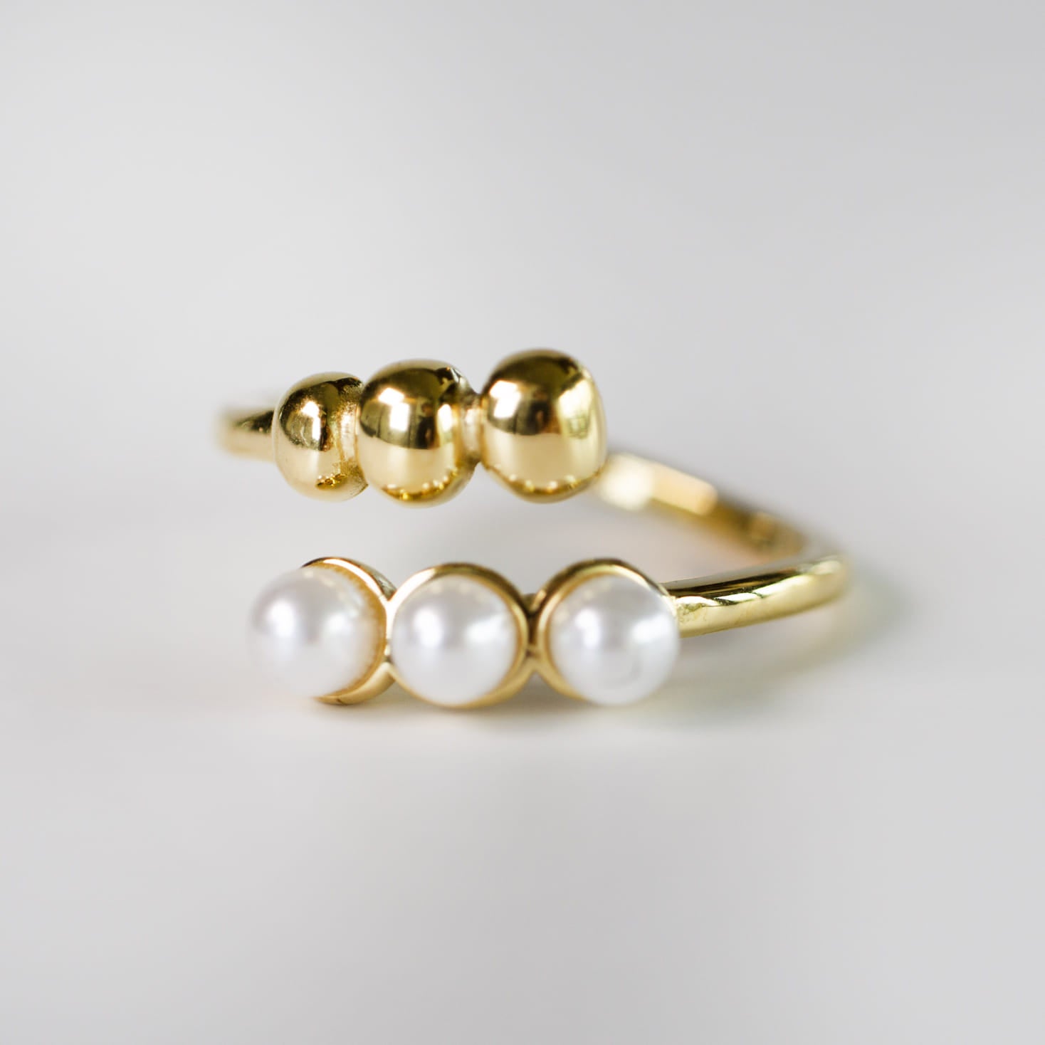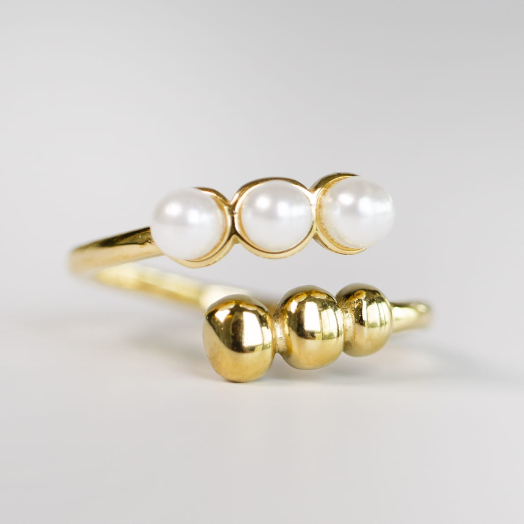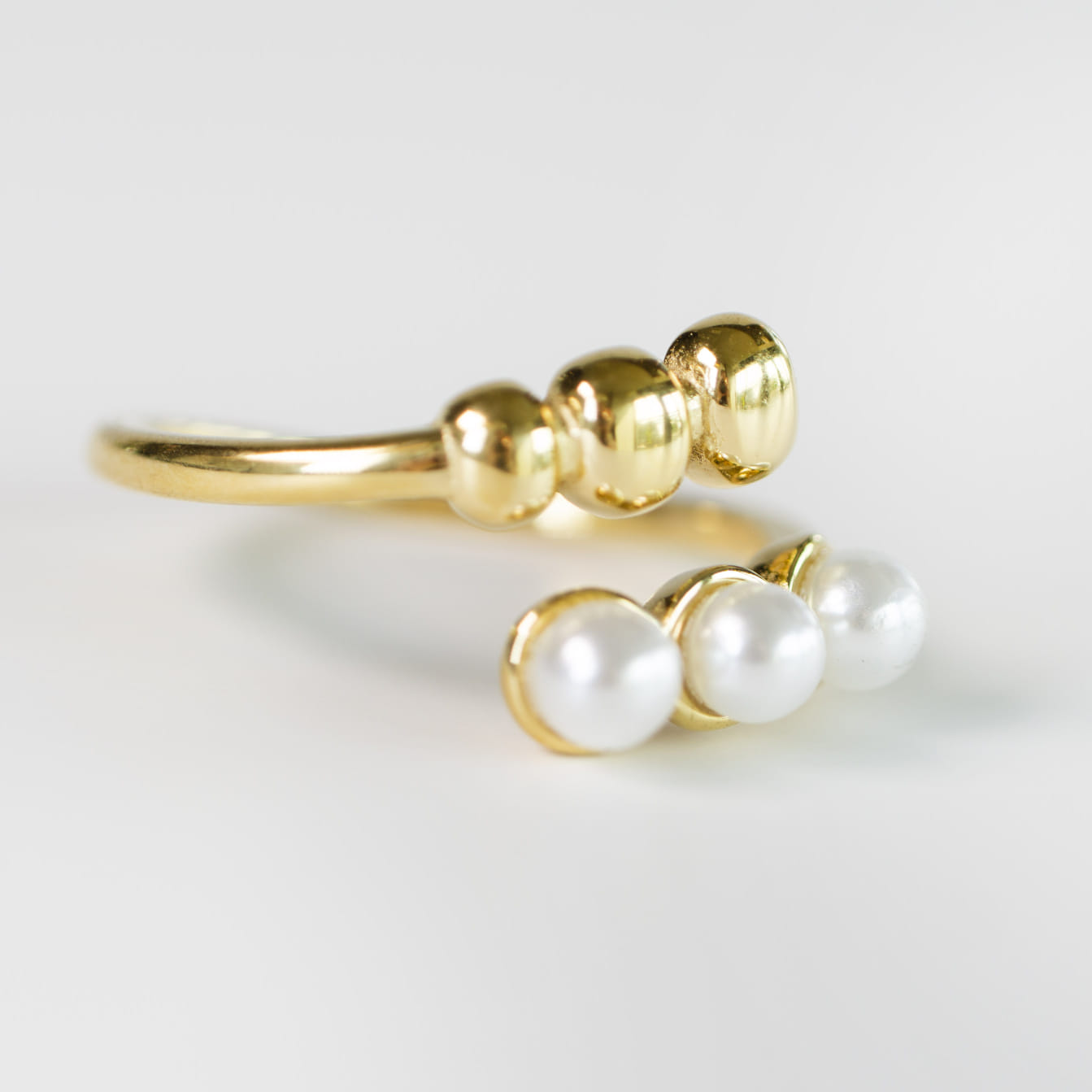 Sturdy alloy core for structural integrity and comfortable wear. Smooth, radiant 18k PVD gold plating. Three polished gold beads + three luminous white pearls, balancing warmth and grace.