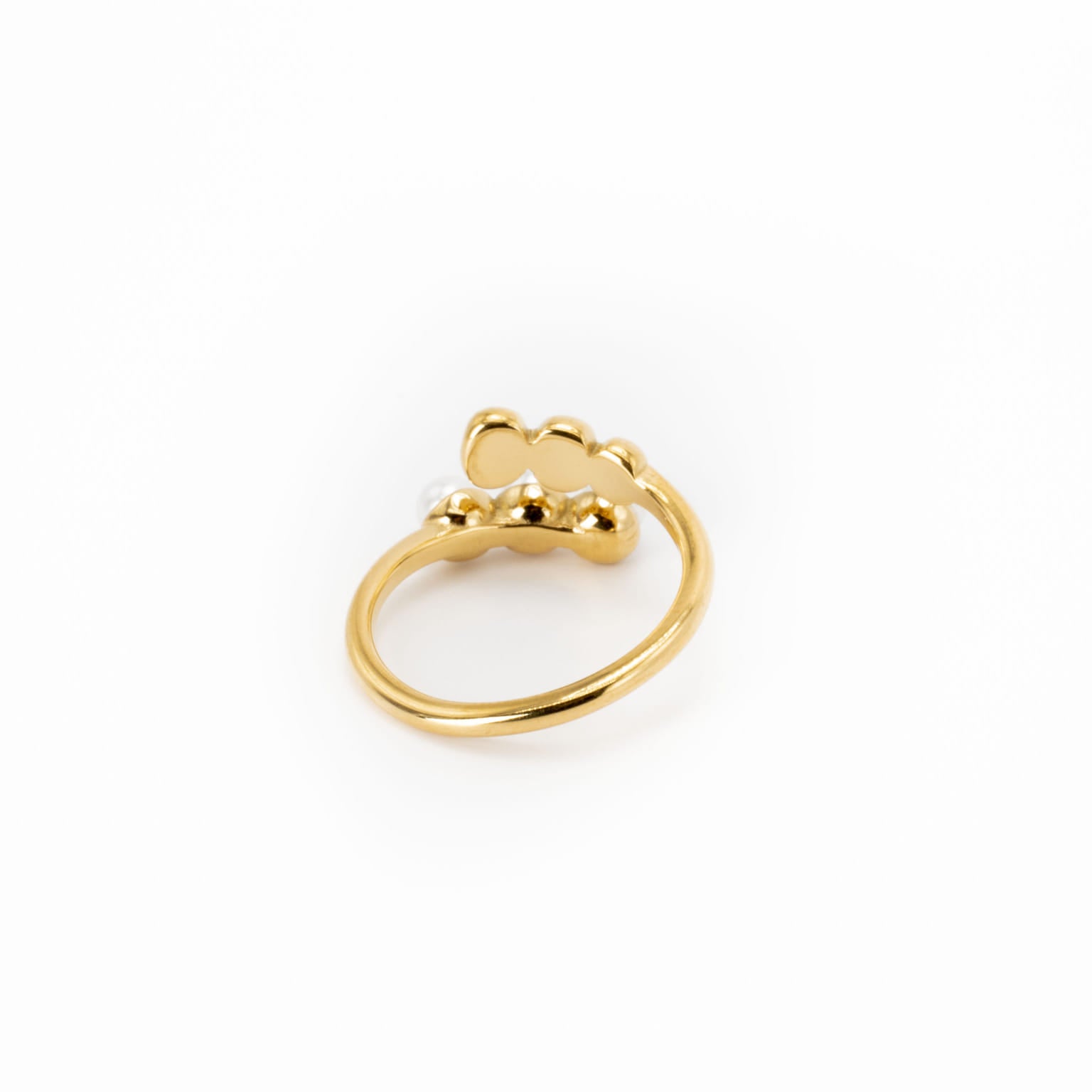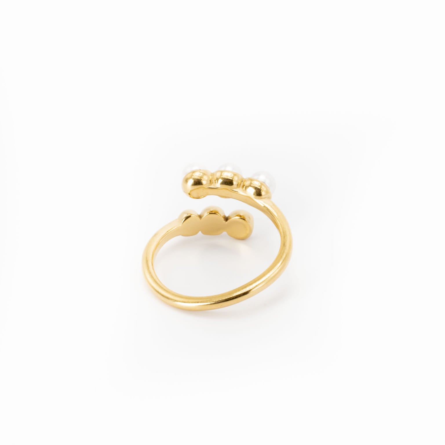 This asymmetric design features six decorative spheres—three gold beads and three pearls—set on opposing sides of the ring’s open curve, creating visual rhythm and tension The thoughtful placement of elements evokes balance, duality, and harmony between metallic shine and organic luster. Lightweight yet sculptural, it’s designed to make a subtle yet unforgettable impression.