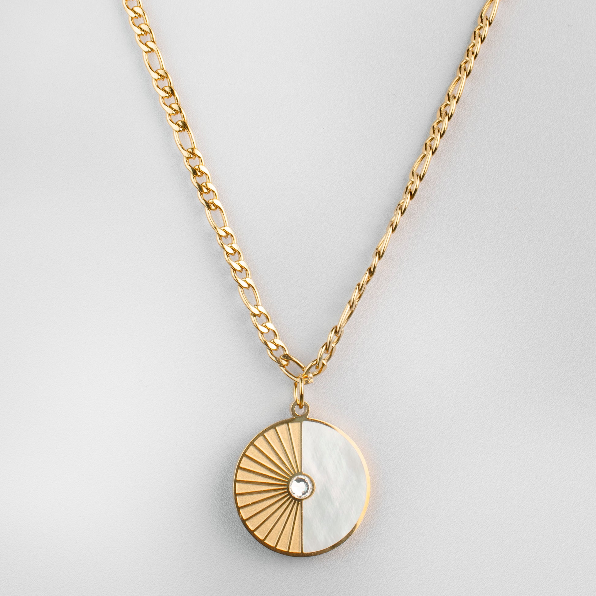 This stunning necklace is a true marriage of elegance and symbolism. Crafted with 14K PVD gold plating, the chain exudes warmth and sophistication, ensuring durability while maintaining its luminou...