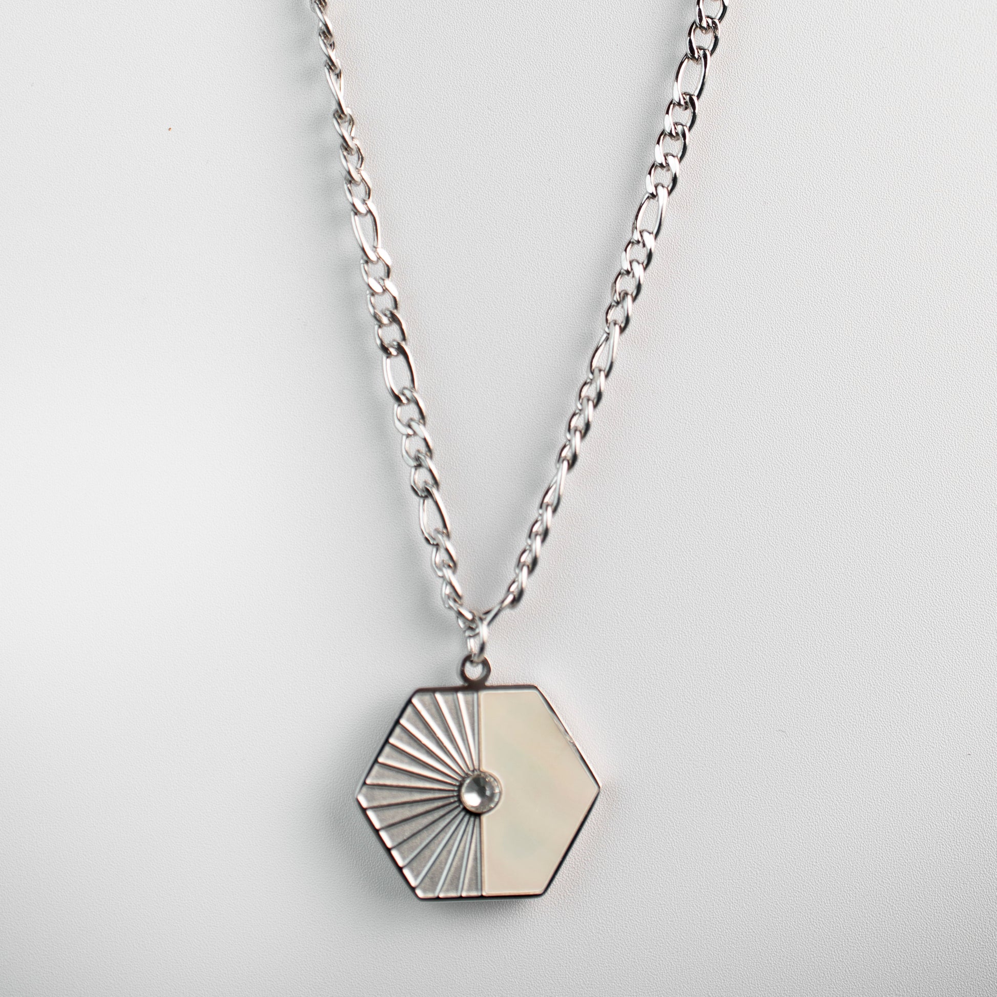 This captivating necklace embodies strength and refinement, showcasing a pentagonal charm that merges geometric balance with organic elegance. Crafted in 18K PVD gold plating, the chain radiates wa...