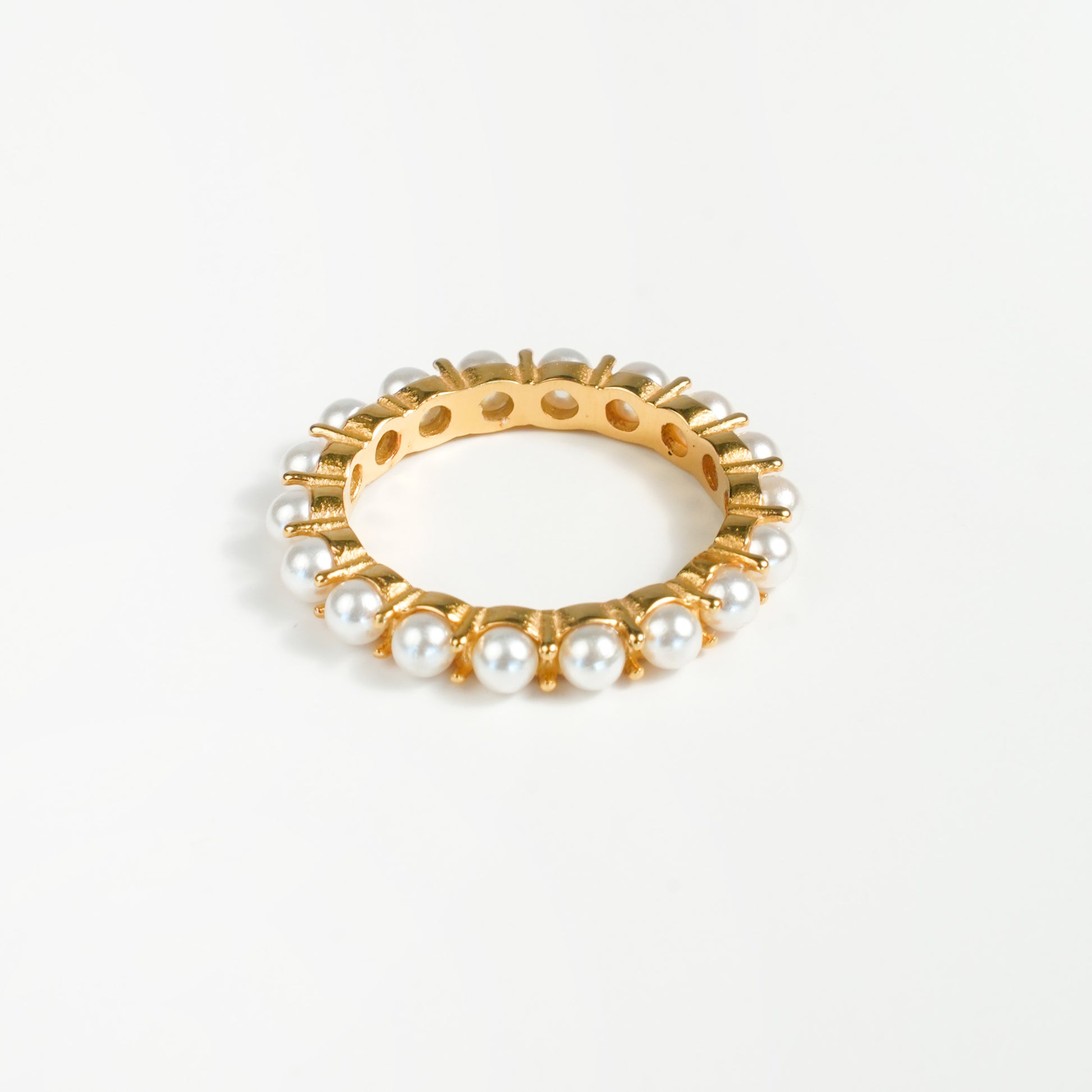Meet The Eternal Pearls Band mesmerizing fusion ofradiant gold and delicate pearls. This exquisite ringfeatures a stainless-steel base plated with 14K gold viaadvanced PVD technology, ensuring a lu...