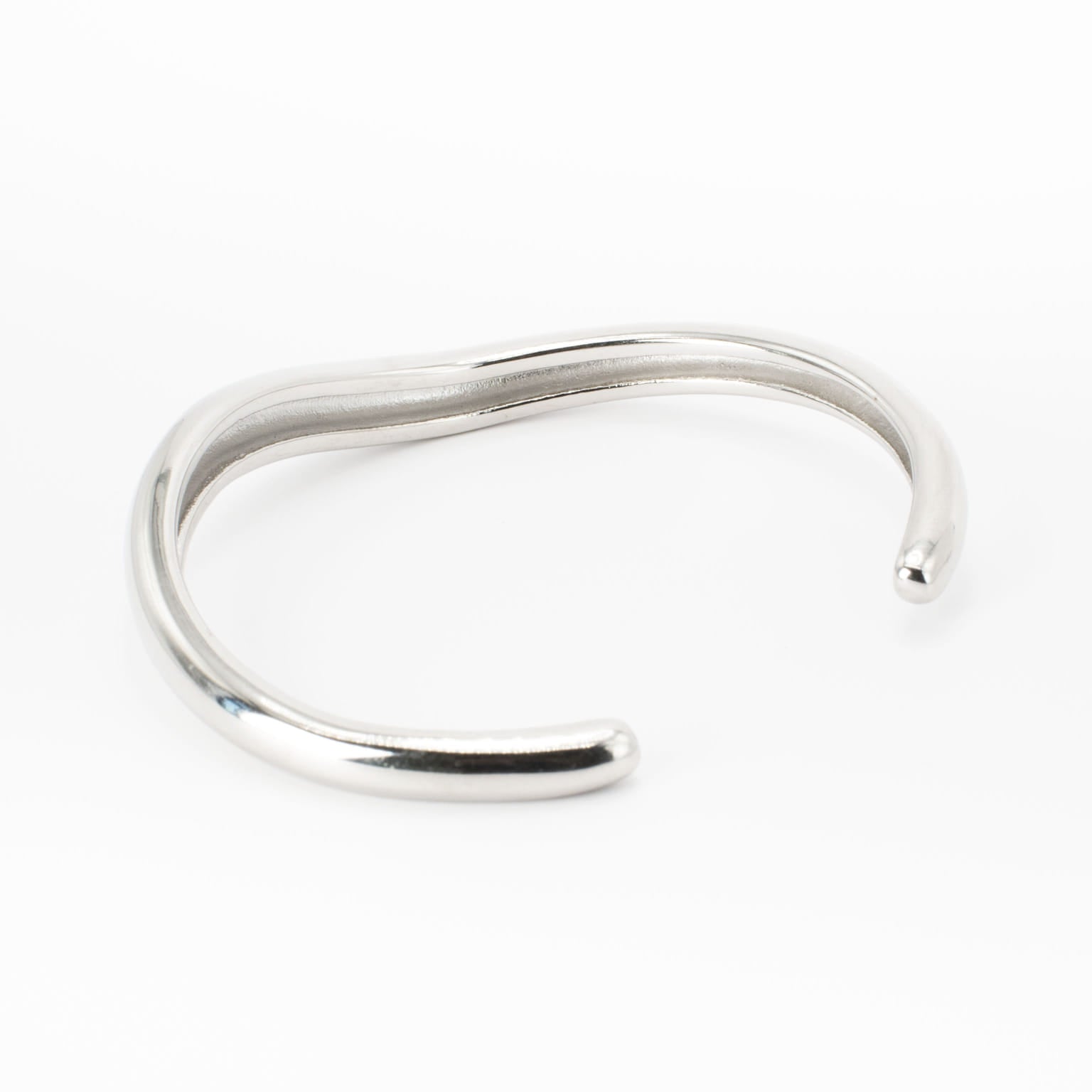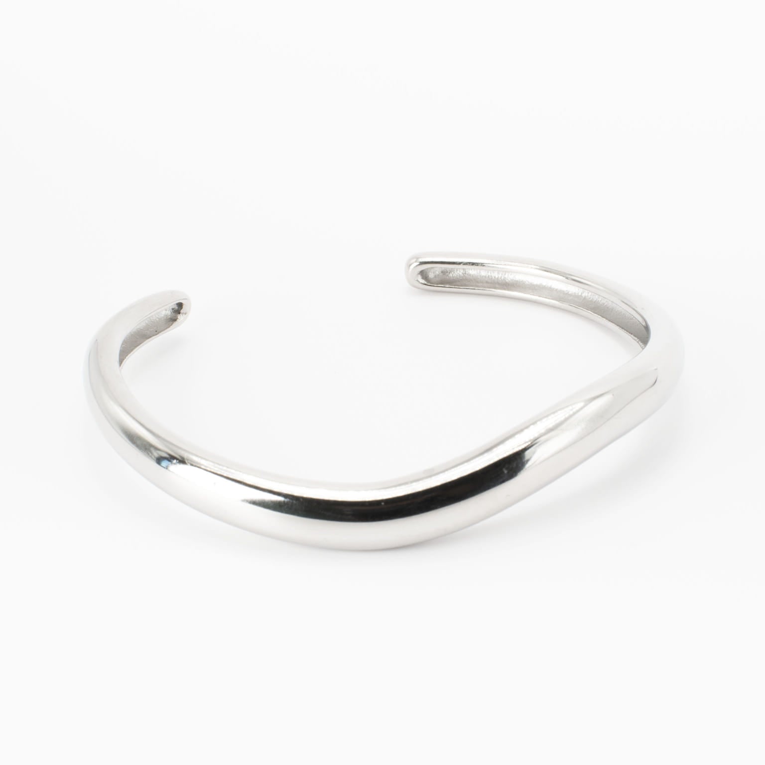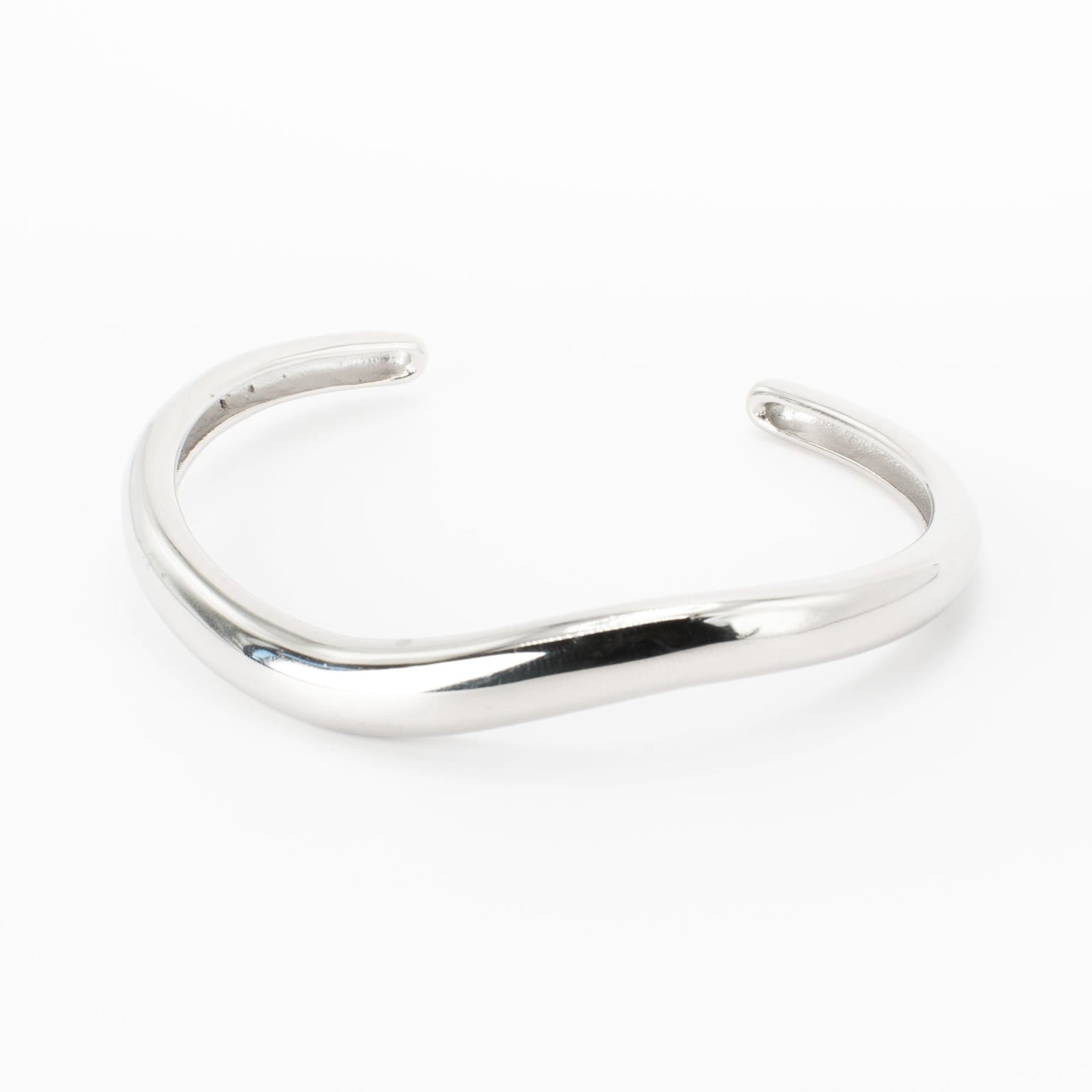 Sleek, open‑ended cuff with a gently asymmetric curve that hugs the wrist. The slim, sculpted profile tapers slightly at each end for refined balance and effortless layering. Clean lines and a high‑shine surface create a minimalist silhouette that reads both delicate and architectural, designed to move with the wearer while keeping a poised, elegant presence.