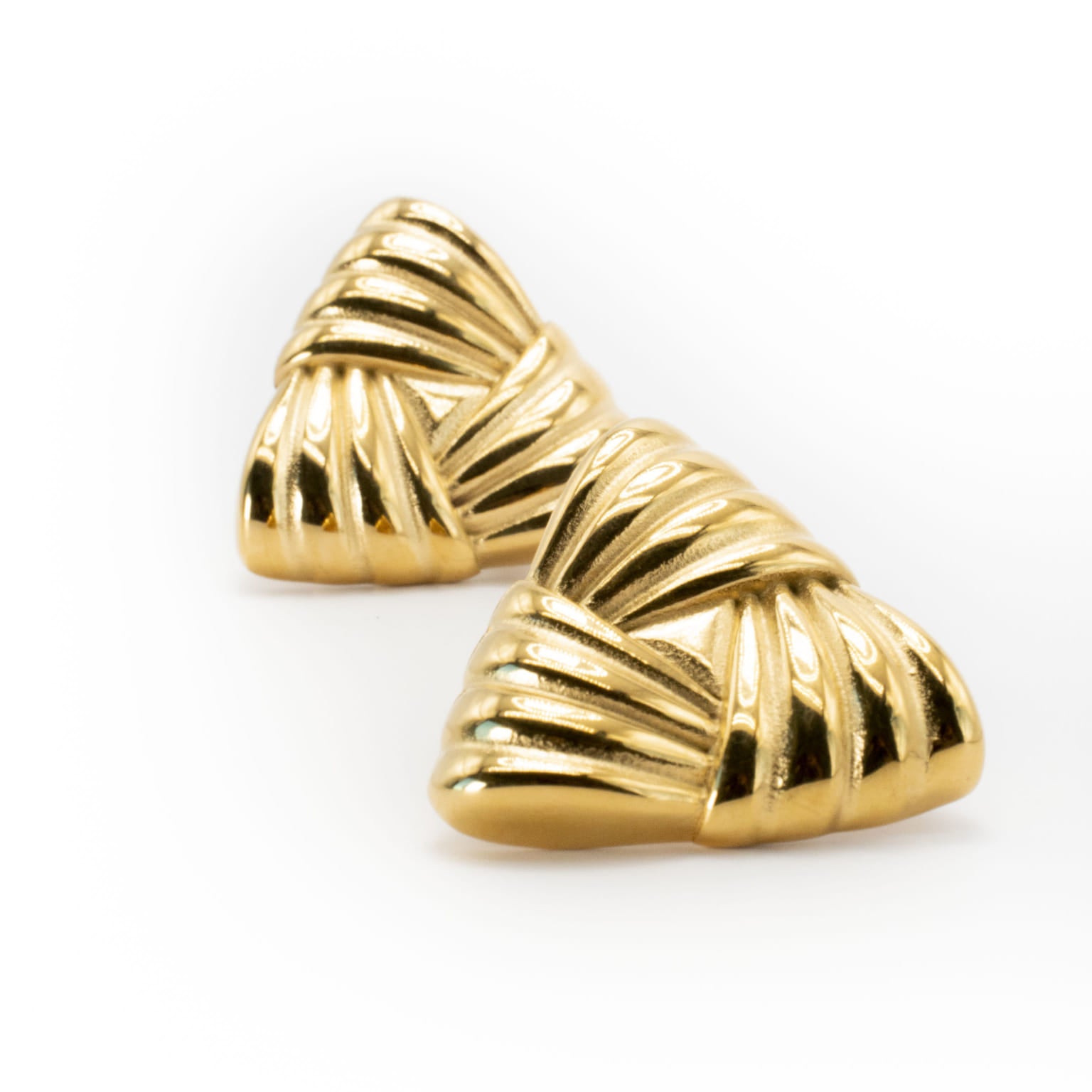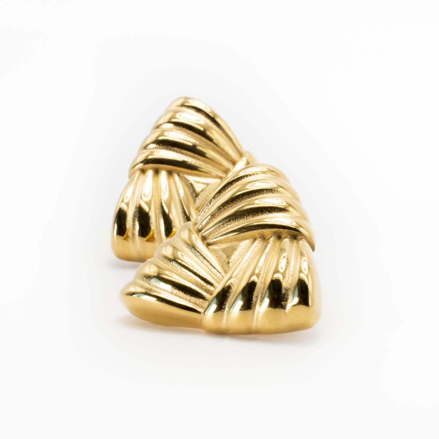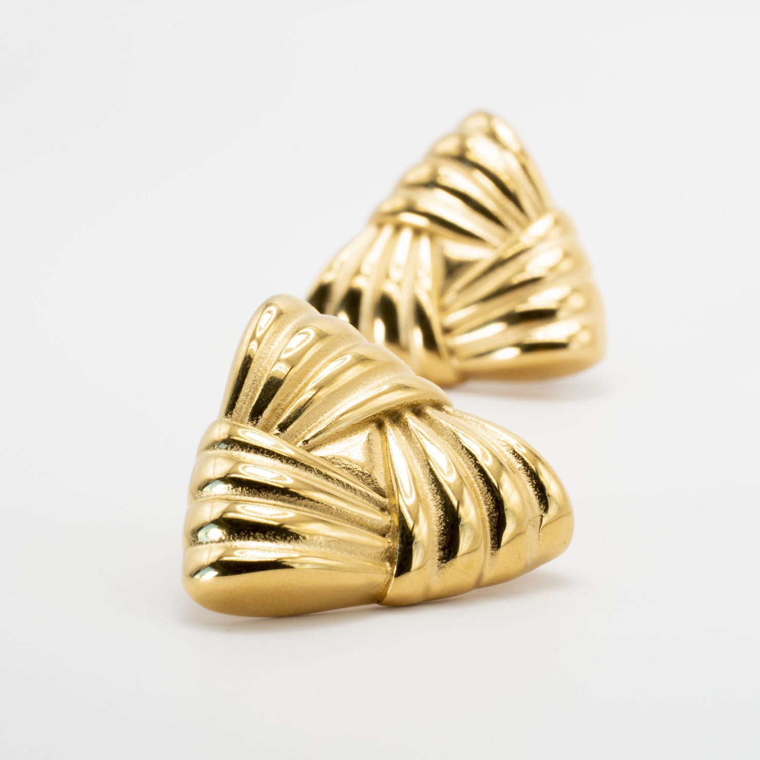 This studs style channel raw light and bold emotion through a fragmented surface. These triangular studs, forged in 18K PVD gold-plated stainless steel, feature etched ridges and sculpted grooves, echoing the cracked shimmer of sunlight on molten terrain. Their dimensional texture turns every angle into a statement—elevated, imperfect, unforgettable.
