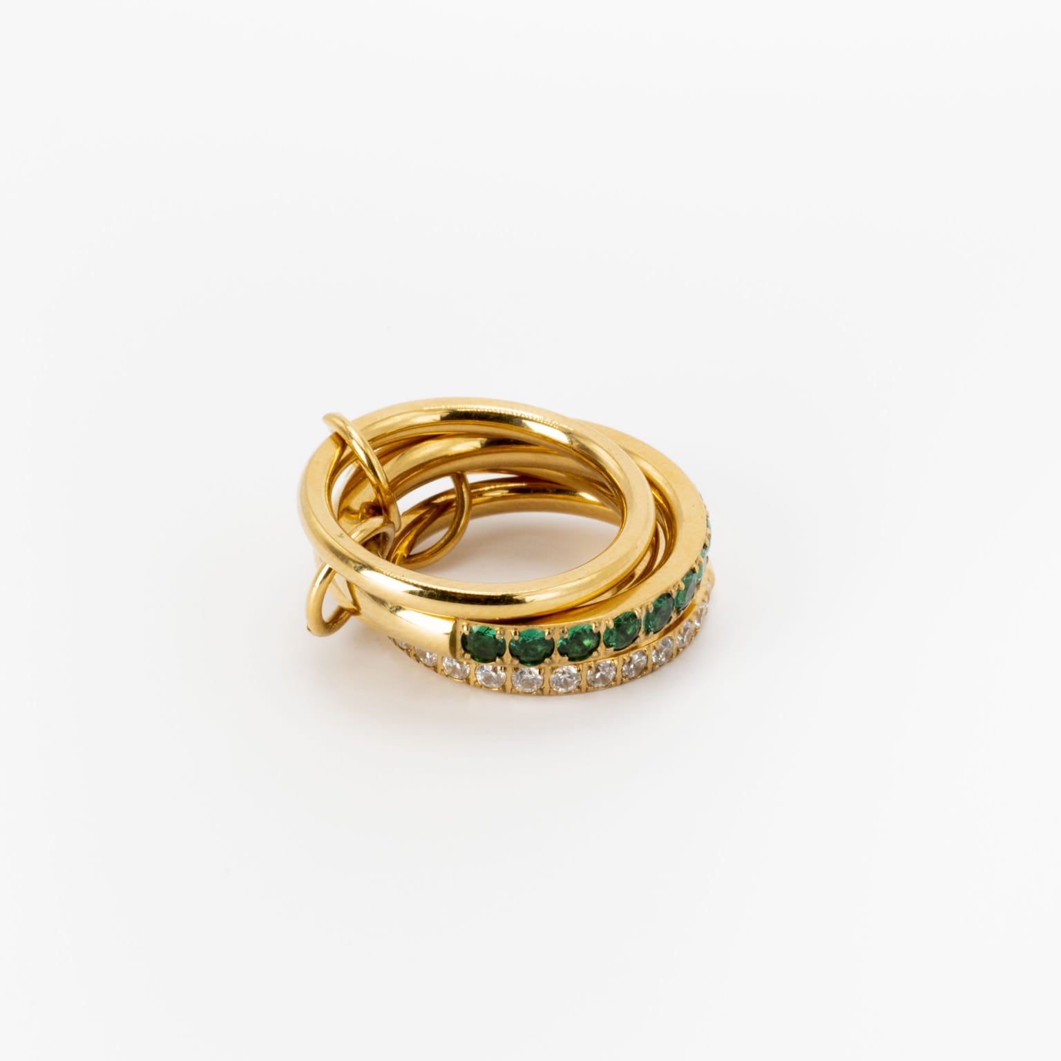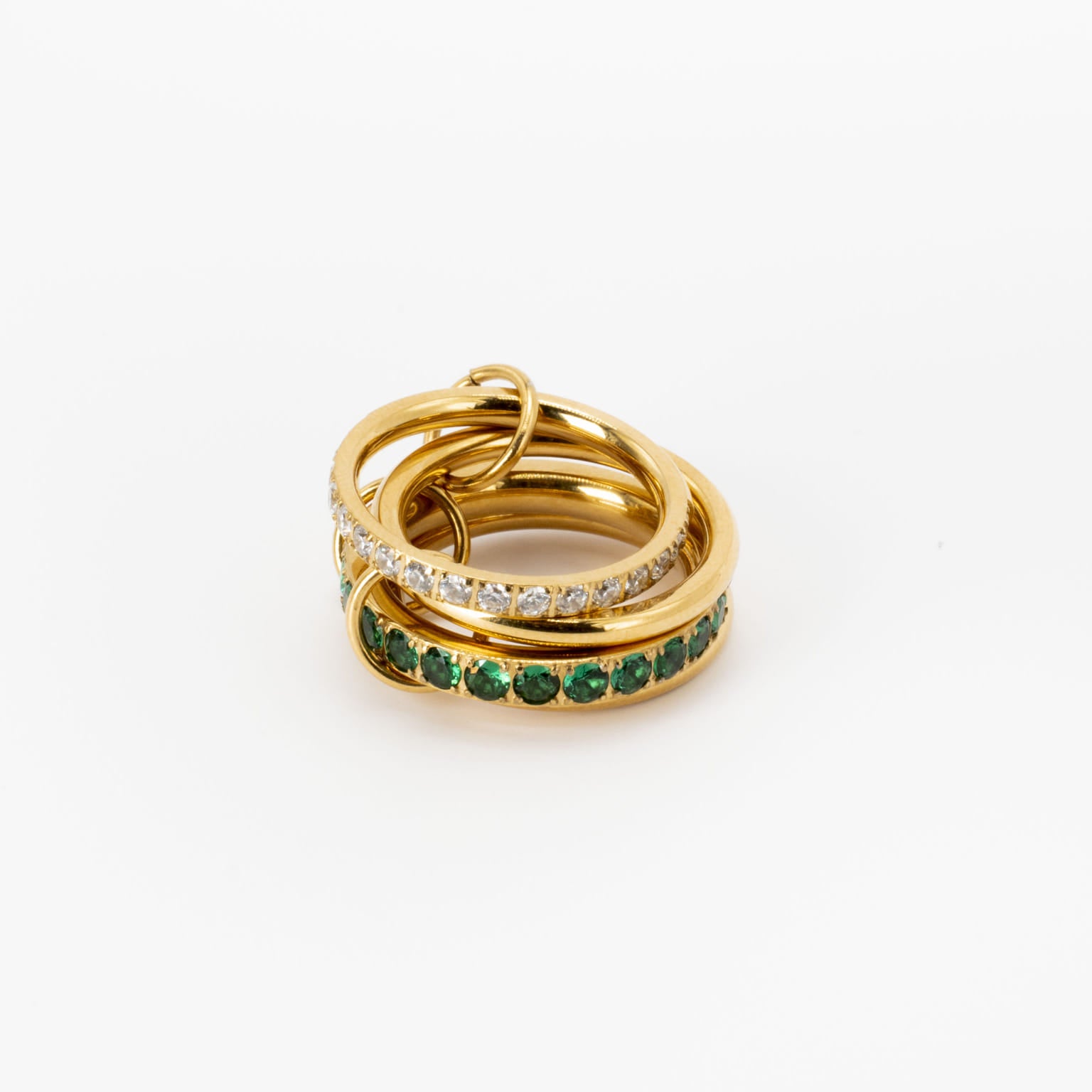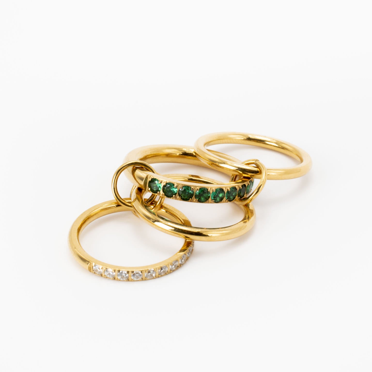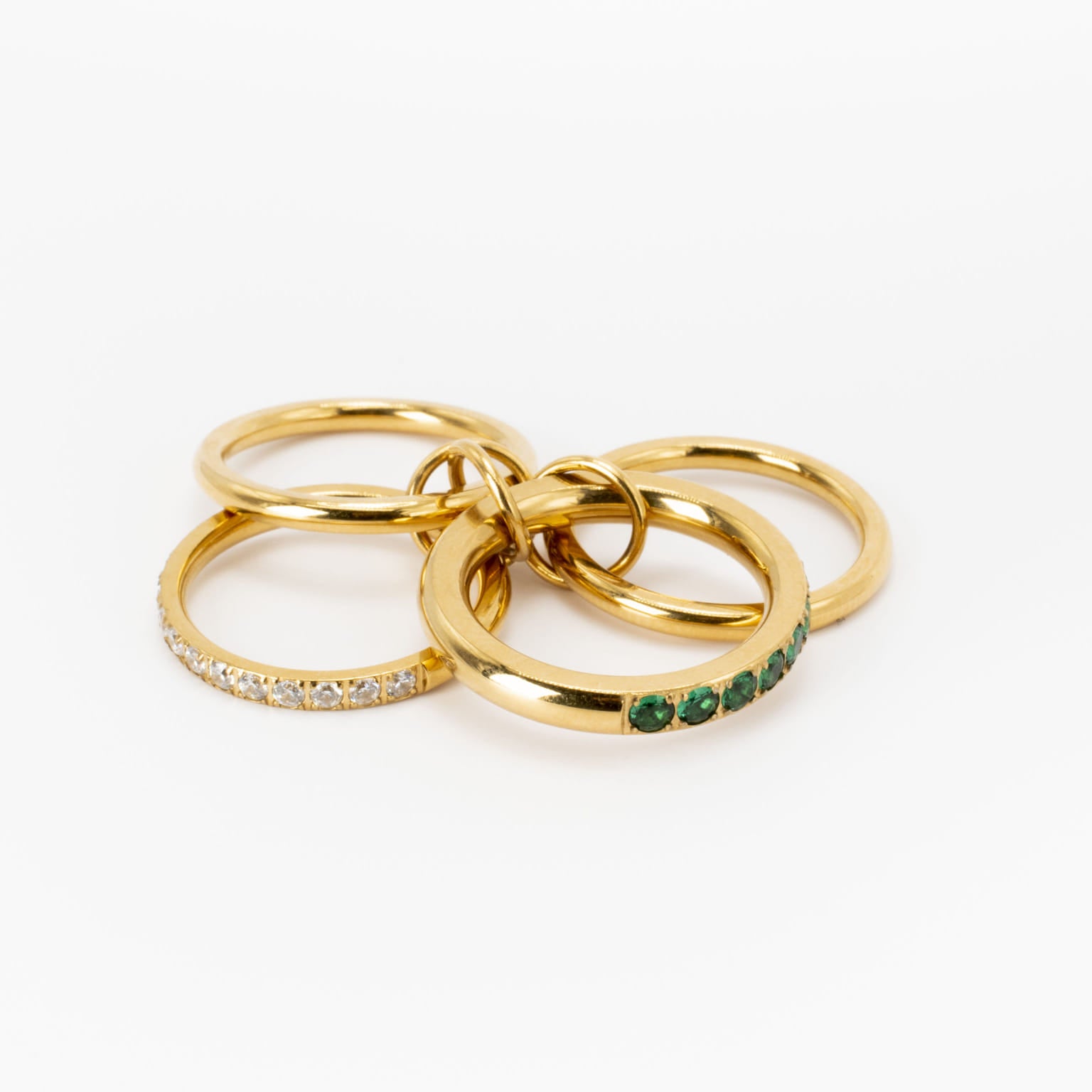 Durable base material waterproof stainless steel for long-lasting wear, finished legant 18k gold plating, offering a rich, polished shine. Layered with Gemstones, one ring with green stones encircling the band for a vibrant pop, one band with siconia stones for a classic, crystalline sparkle & two minimalist gold bands for balance and layering versatility