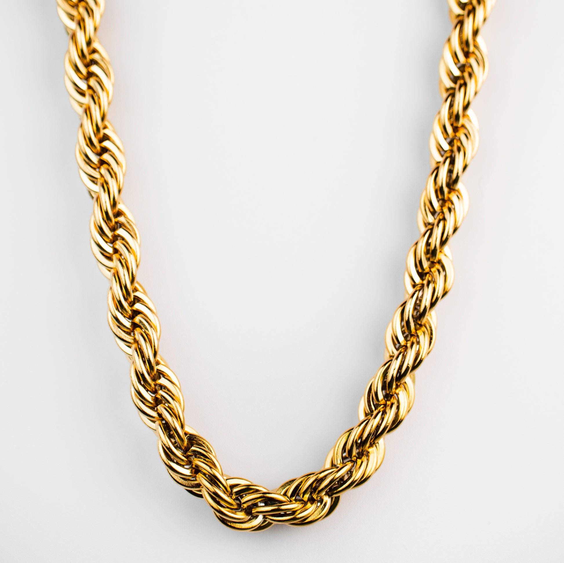 A striking 18K gold-plated rope chain, featuring twisted, interlocking links...