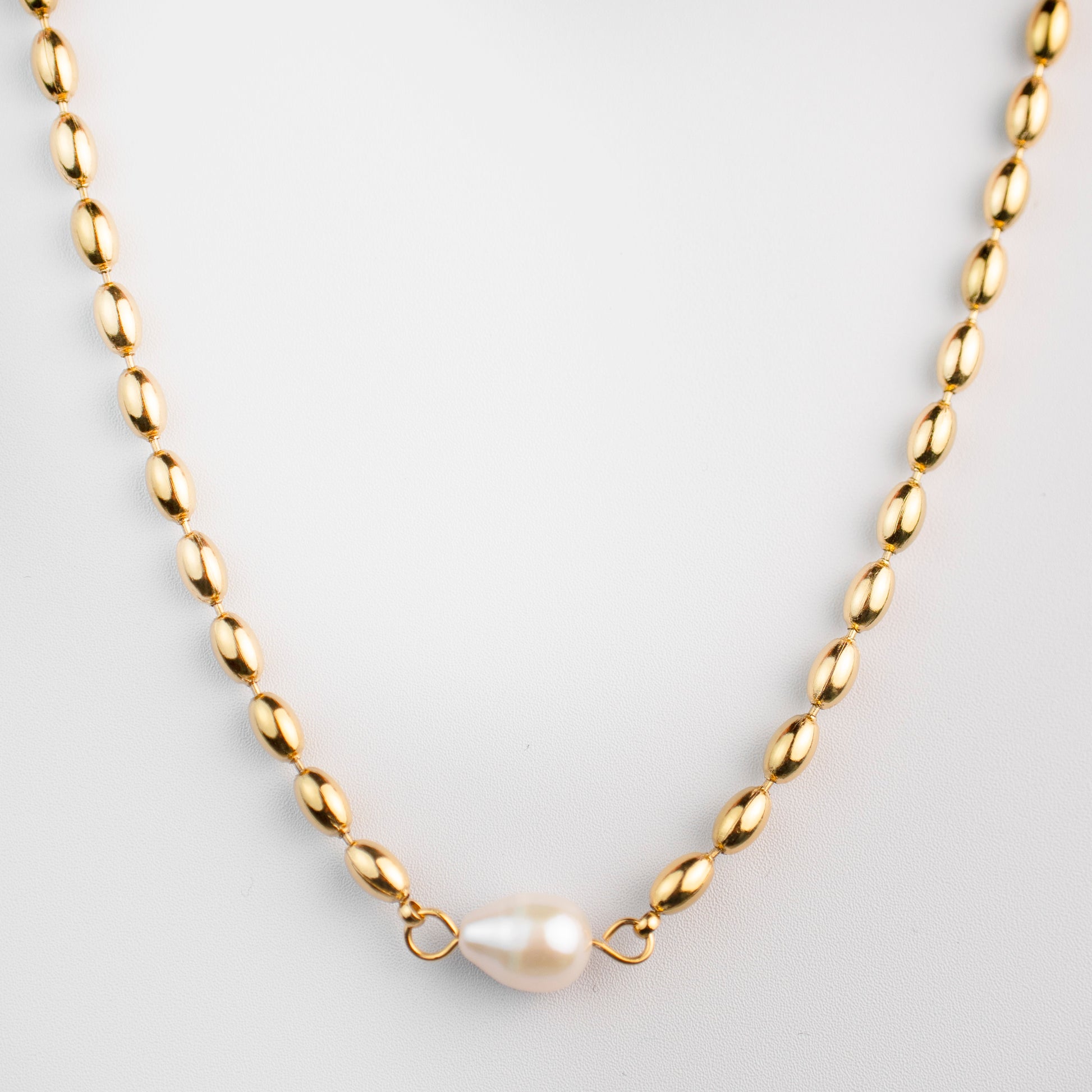 Design: A chain featuring small, oval-shaped gold beads, elegantly leading to a teardrop-shaped pearl drop, blending structured elegance with soft curves.