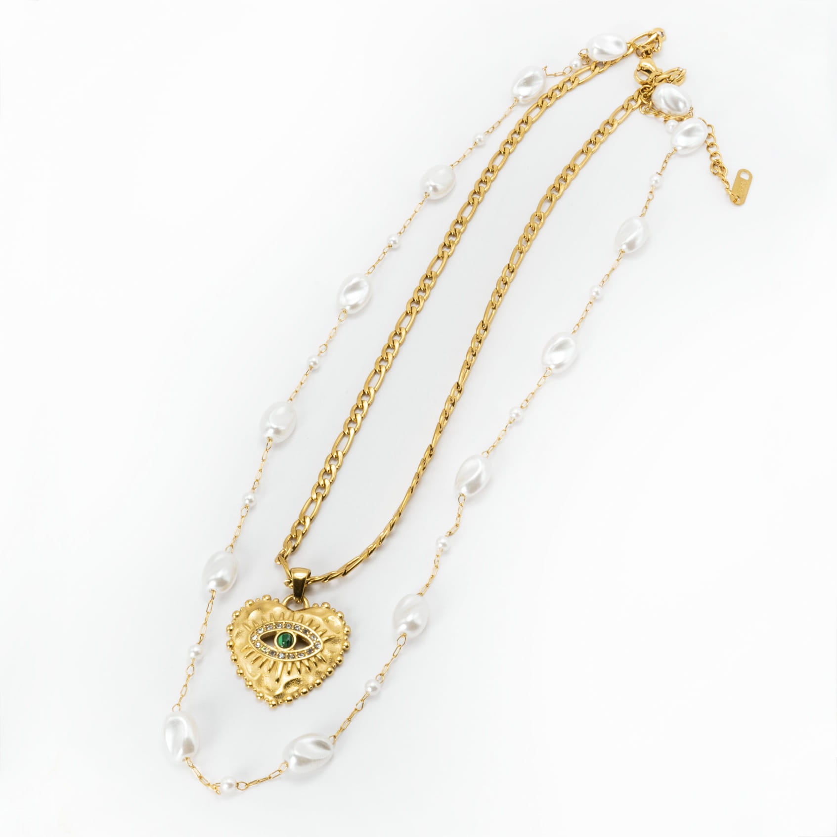 Gold-plated stainless steel construction for both chains, finished with durable 18k-style PVD plating for long-lasting shine and tarnish resistance. The thinner strand is accented with five natural freshwater pearls and tiny gold beads; the heart pendant’s eye motif is set with green and white stones for subtle color contrast. Secure adjustable clasp and tag for comfortable wear.