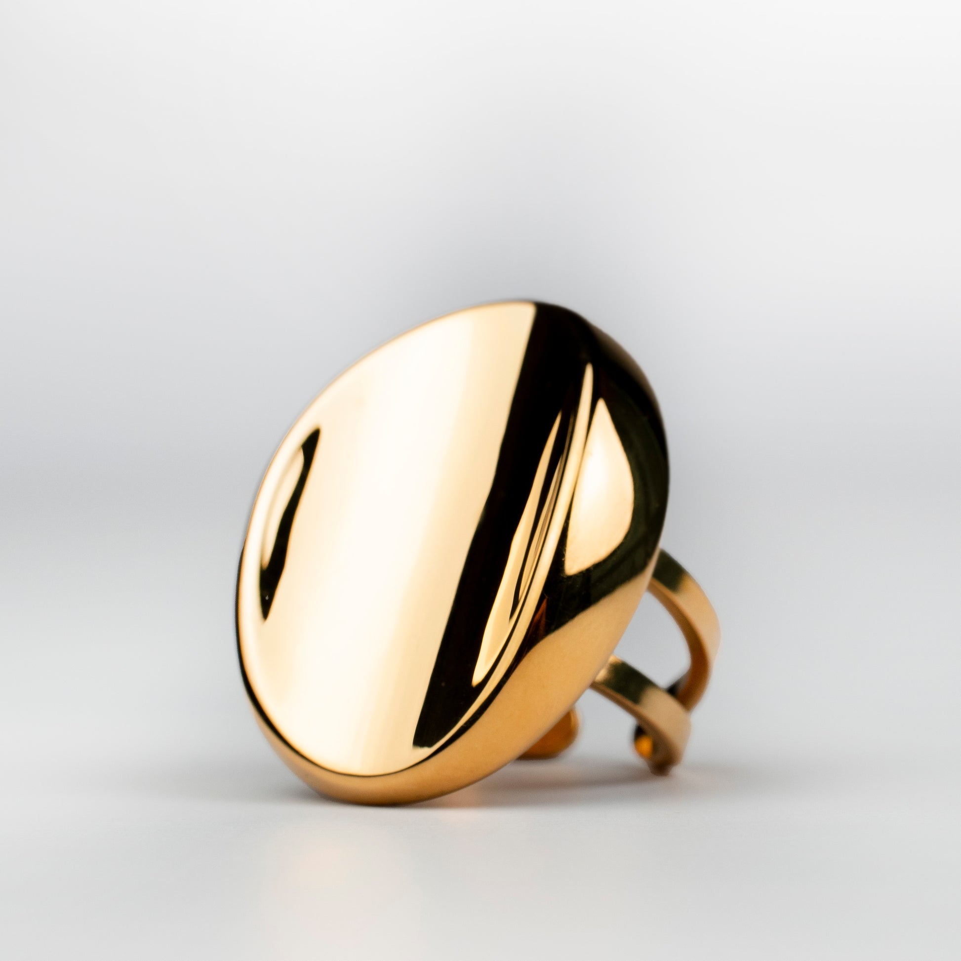 A radiant embodiment of modern elegance and refinedcraftsmanship. With its smooth, dome-shapedcenterpiece and split band design, this exquisite goldring captures the essence of sophistication. The ...