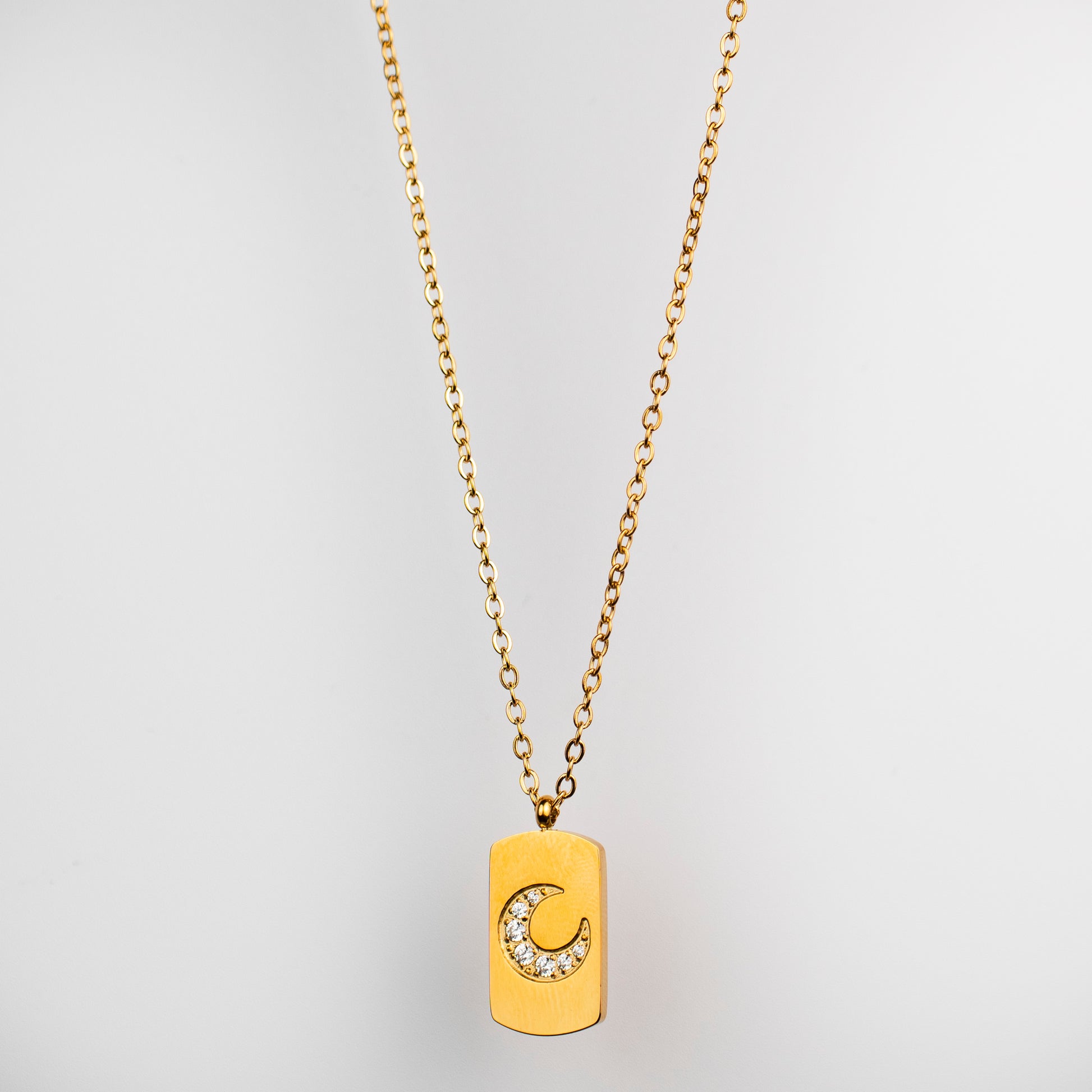 This exquisite 18K gold-plated necklace embodies celestial beauty and understated elegance. Featuring a delicate rectangular pendant adorned with a shimmering crescent moon motif, the piece is desi...