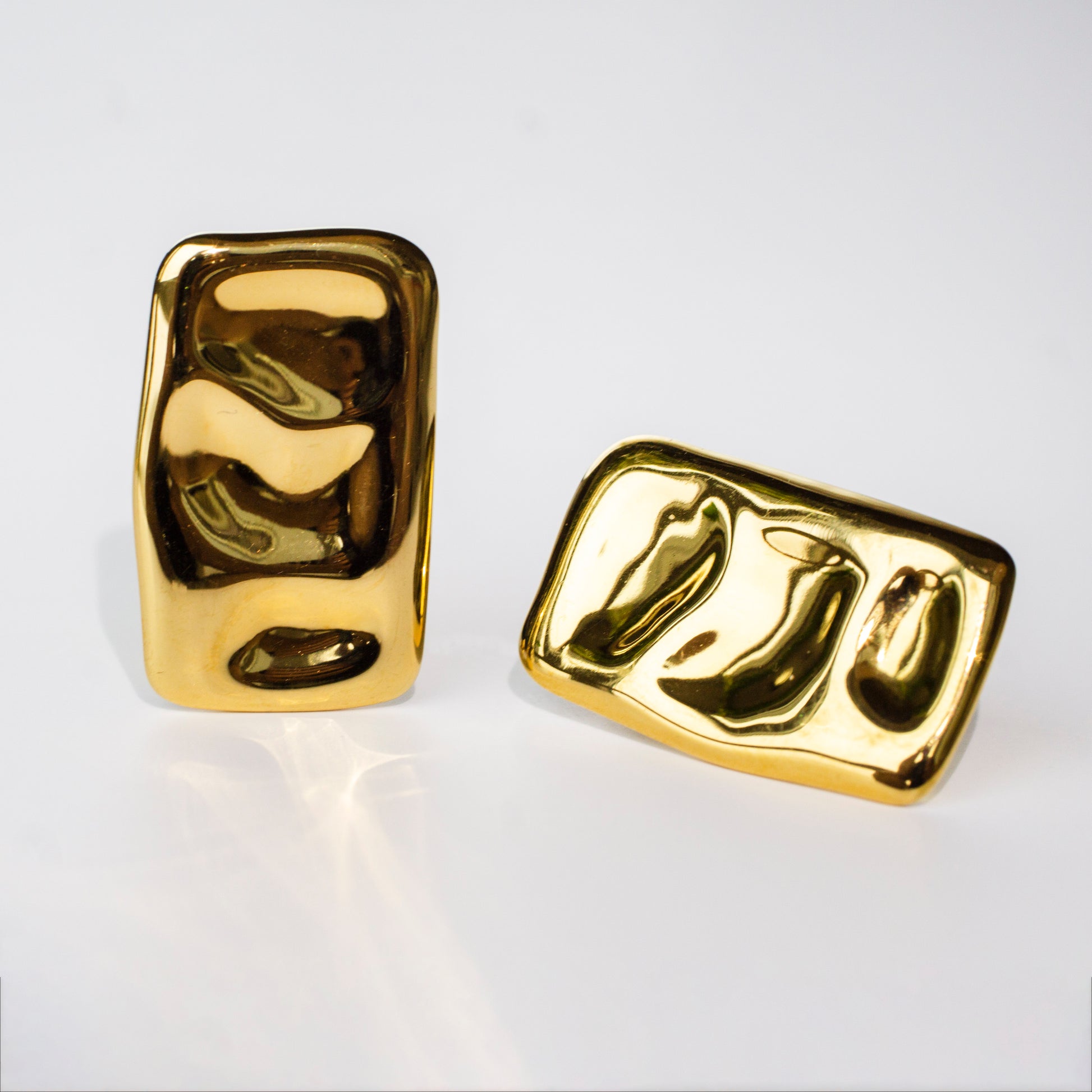 This earrings melt geometric form into flowing elegance. Cast in 18K PVD gold plating over stainless steel, their rectangular shape softens at the corners, mimicking the organic drip of molten meta...