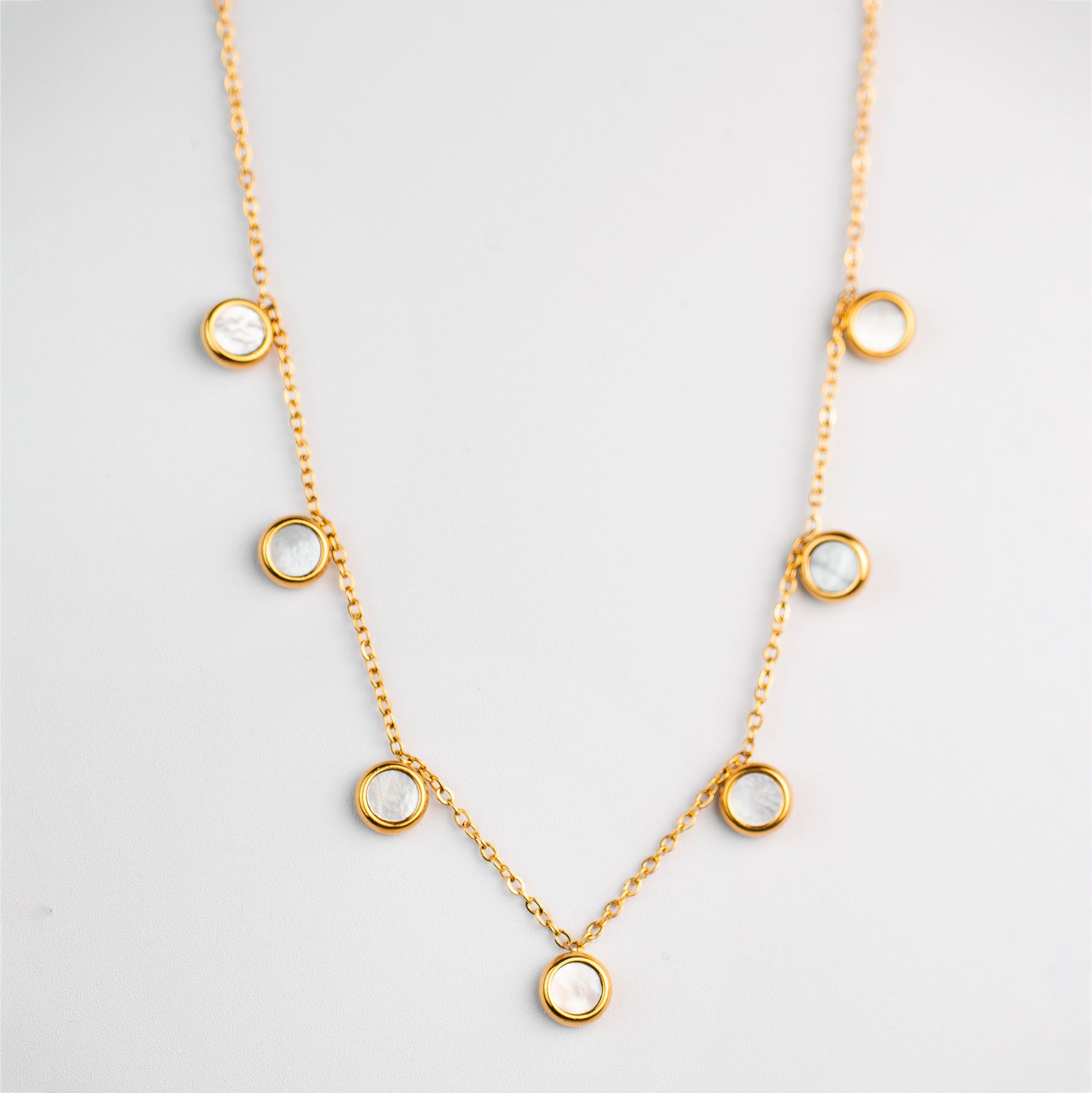 This necklace embodies timeless sophistication and effortless beauty. An ethereal 18K gold-plated necklace, featuring a sequence of round pearl-like beads carefully set within polished gold accents...