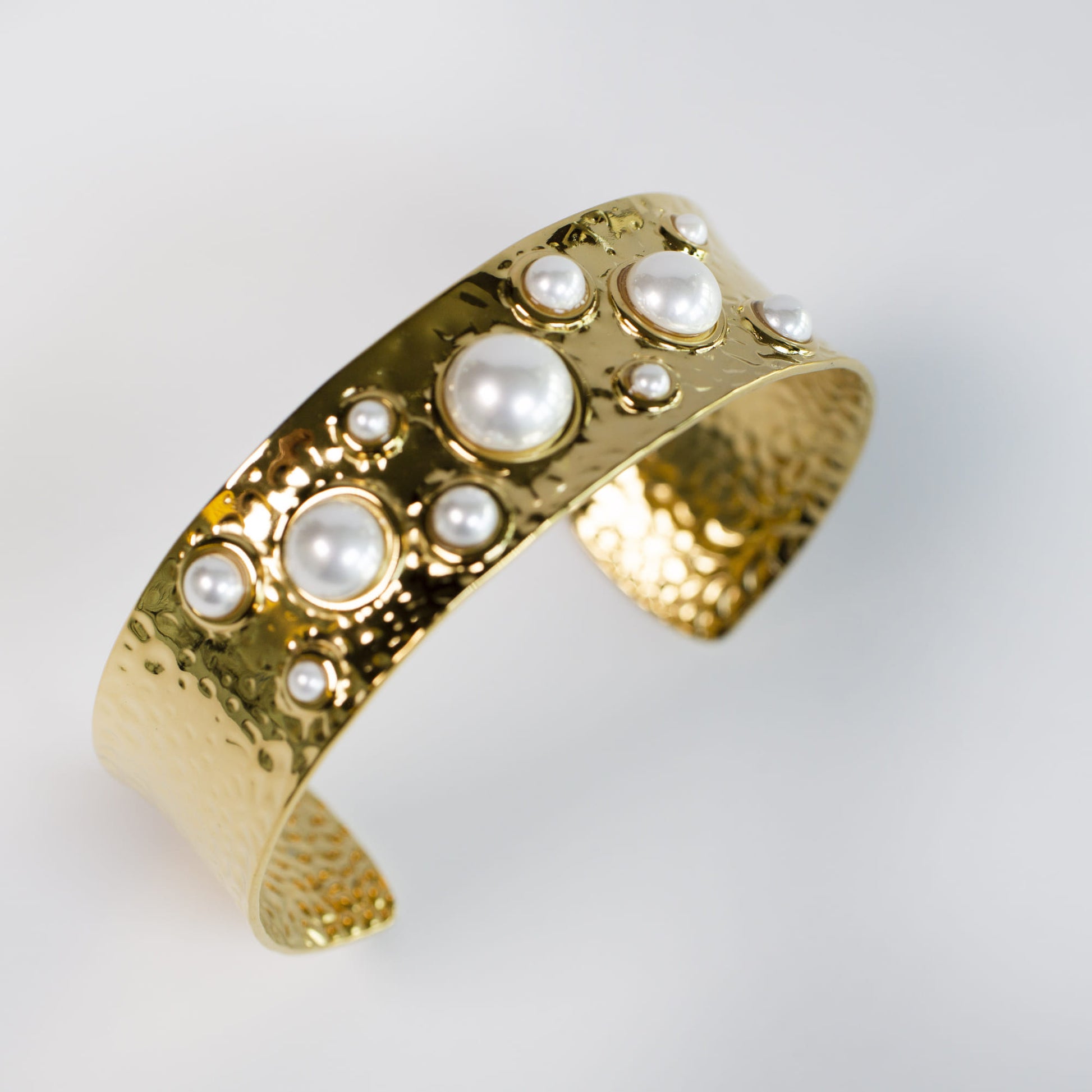 Stainless still material gold plated in 18K PVD with pearl insets resembling seafoam treasures. Matte and glossy metal interplay for depth.