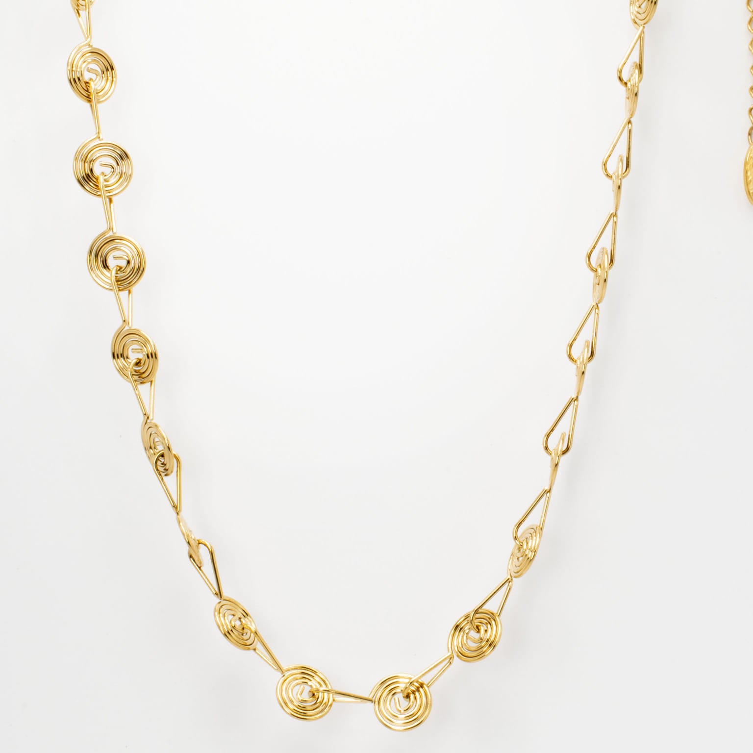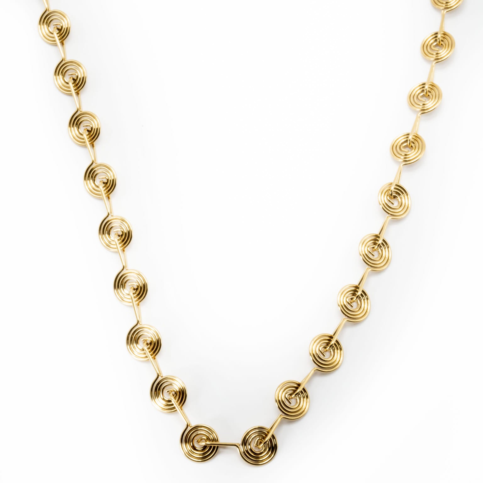 This necklace features a series of circular spiral elements, each resembling a miniature coil, creating texture and rhythm across the neckline. This sculptural design blends artisanal craftsmanship with modern elegance, making it a standout piece