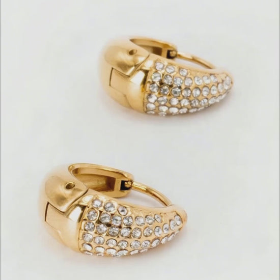 18k gold PVD‑plated stainless steel base for enduring color and scratch resistance. One half of each hoop is densely set with diamond‑like cubic zirconia for high‑impact brilliance while the other half remains polished gold for balanced contrast. Secure hinge‑back closure ensures comfortable, reliable wear.