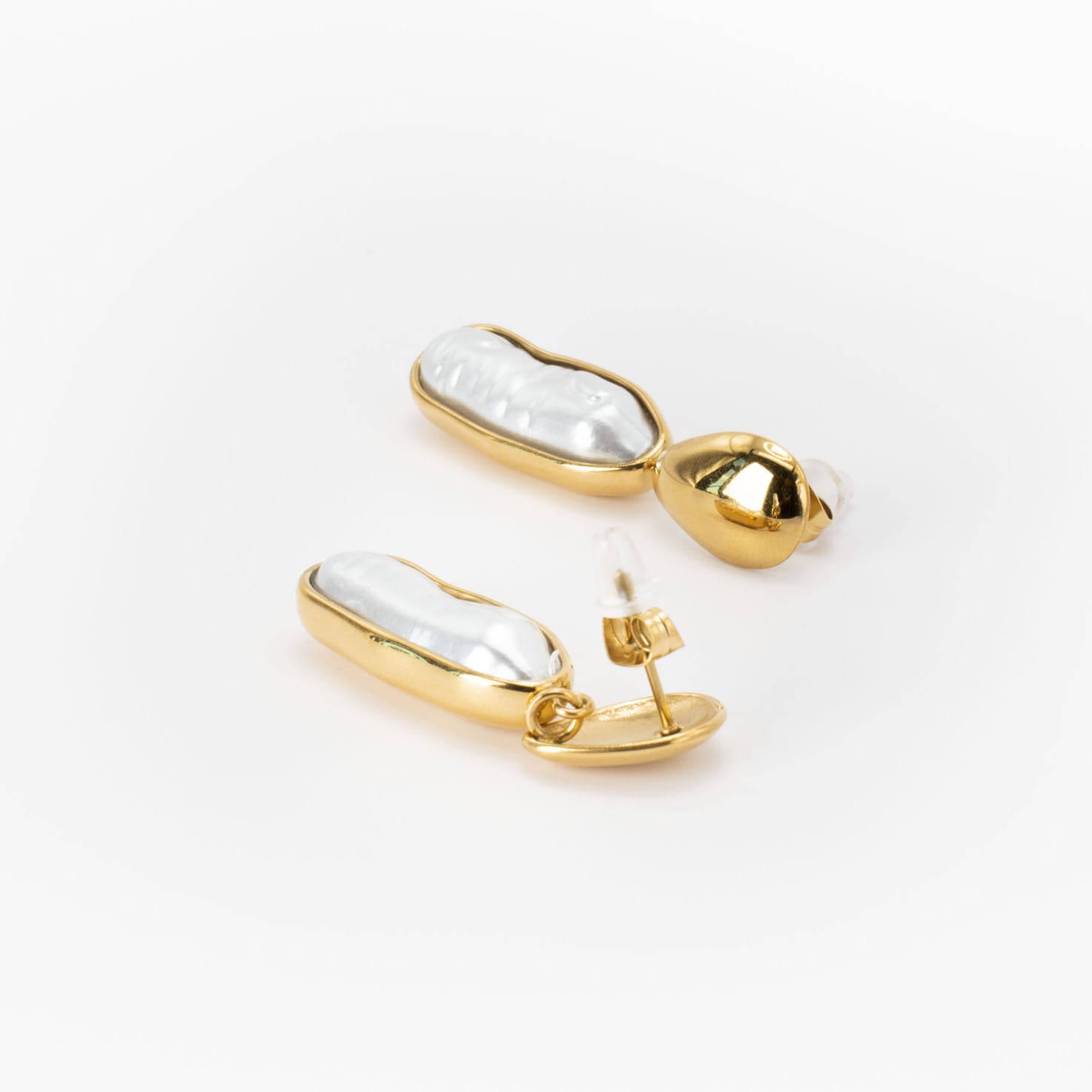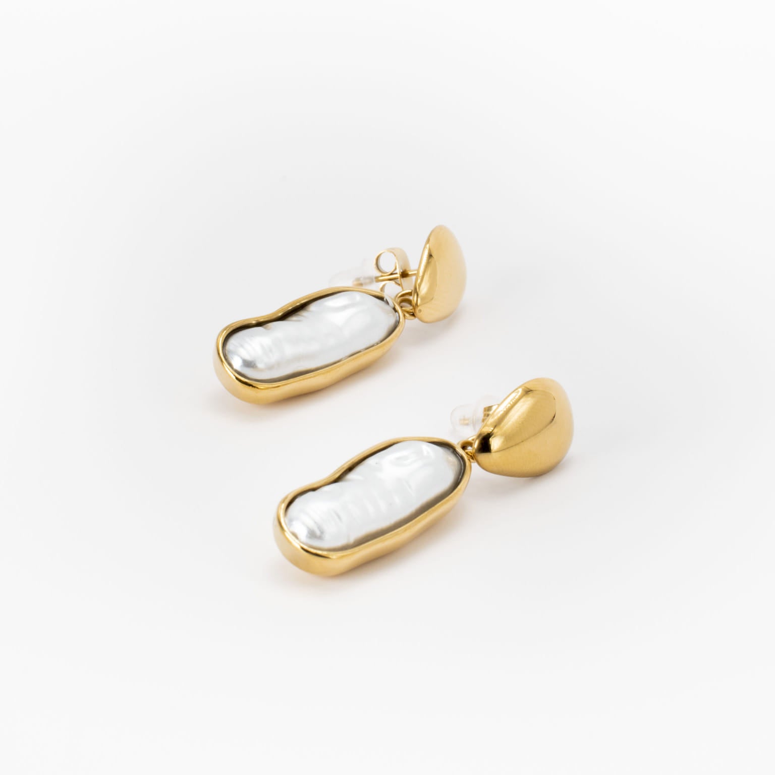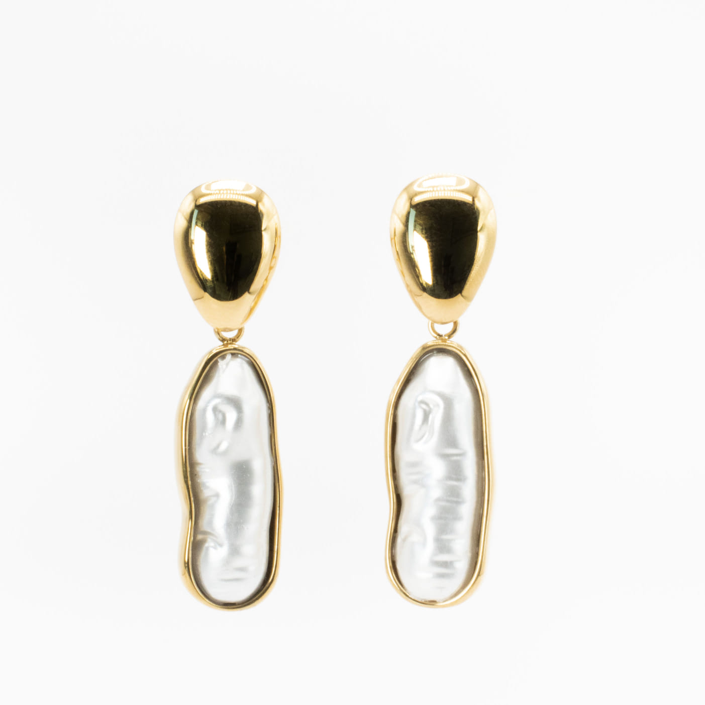 Base material High-quality stainless steel, ensuring durability and water resistance with finishes in radiant 18k PVD gold plating for lasting shine. Irregularly shaped white pearls, nestled within the gold setting for a natural, organic touch