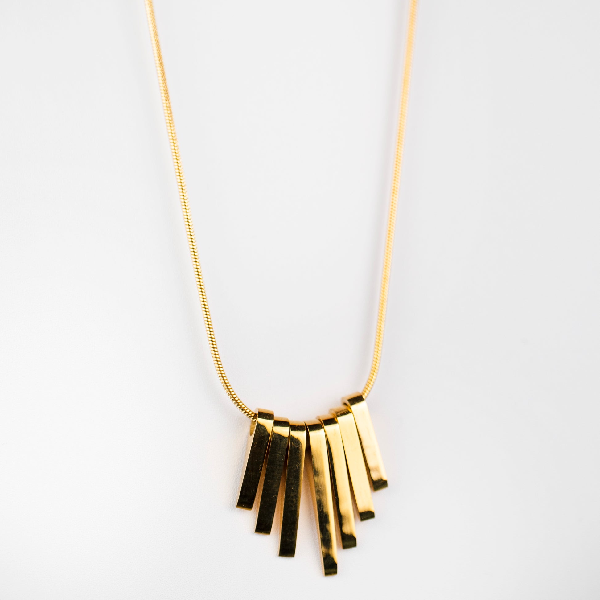 This necklace blends structure with contemporary elegance, making it a bold yet versatile statement piece. An eye-catching 18K gold-plated necklace featuring a pendant composed of rectangular gold ...