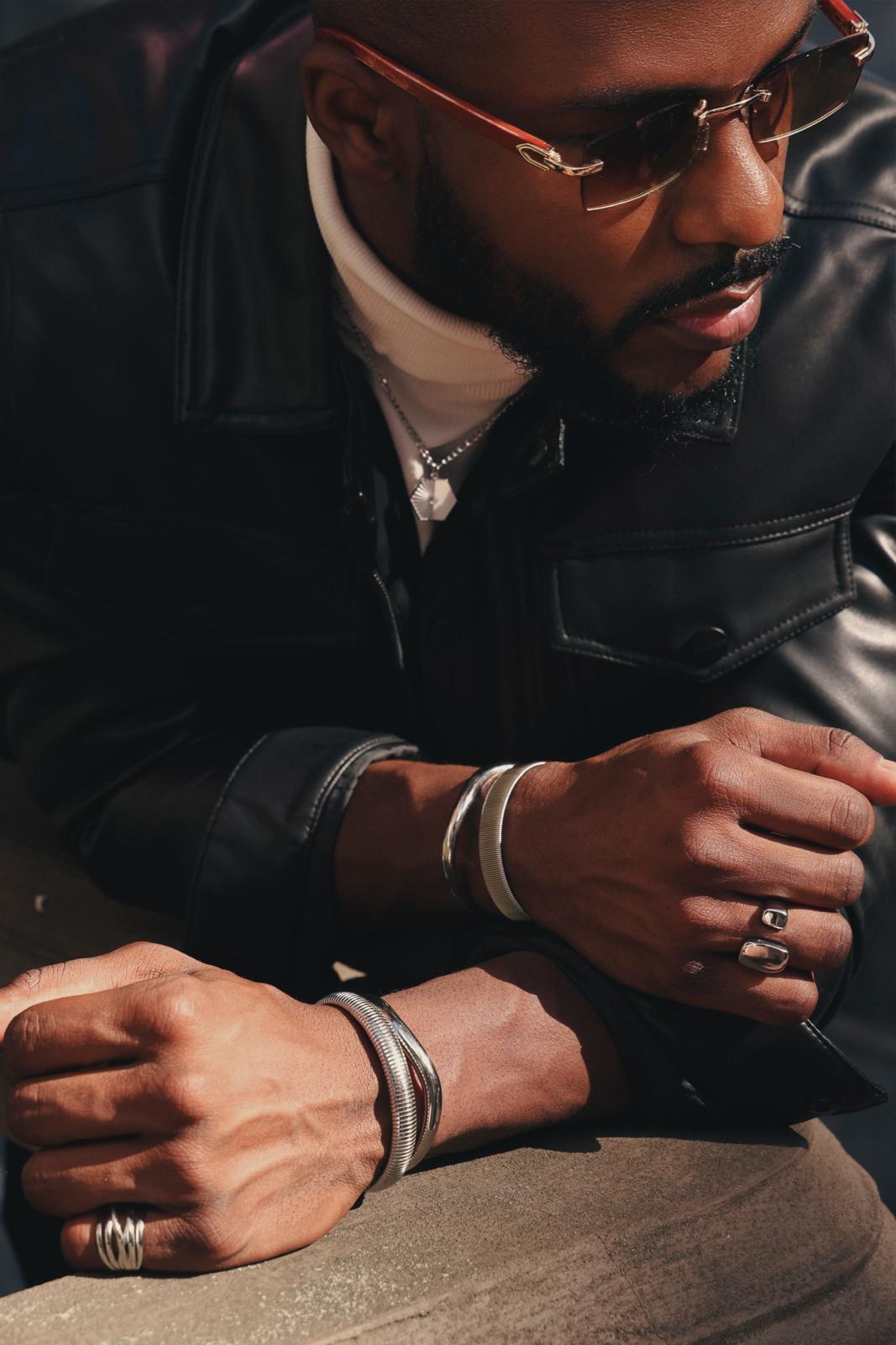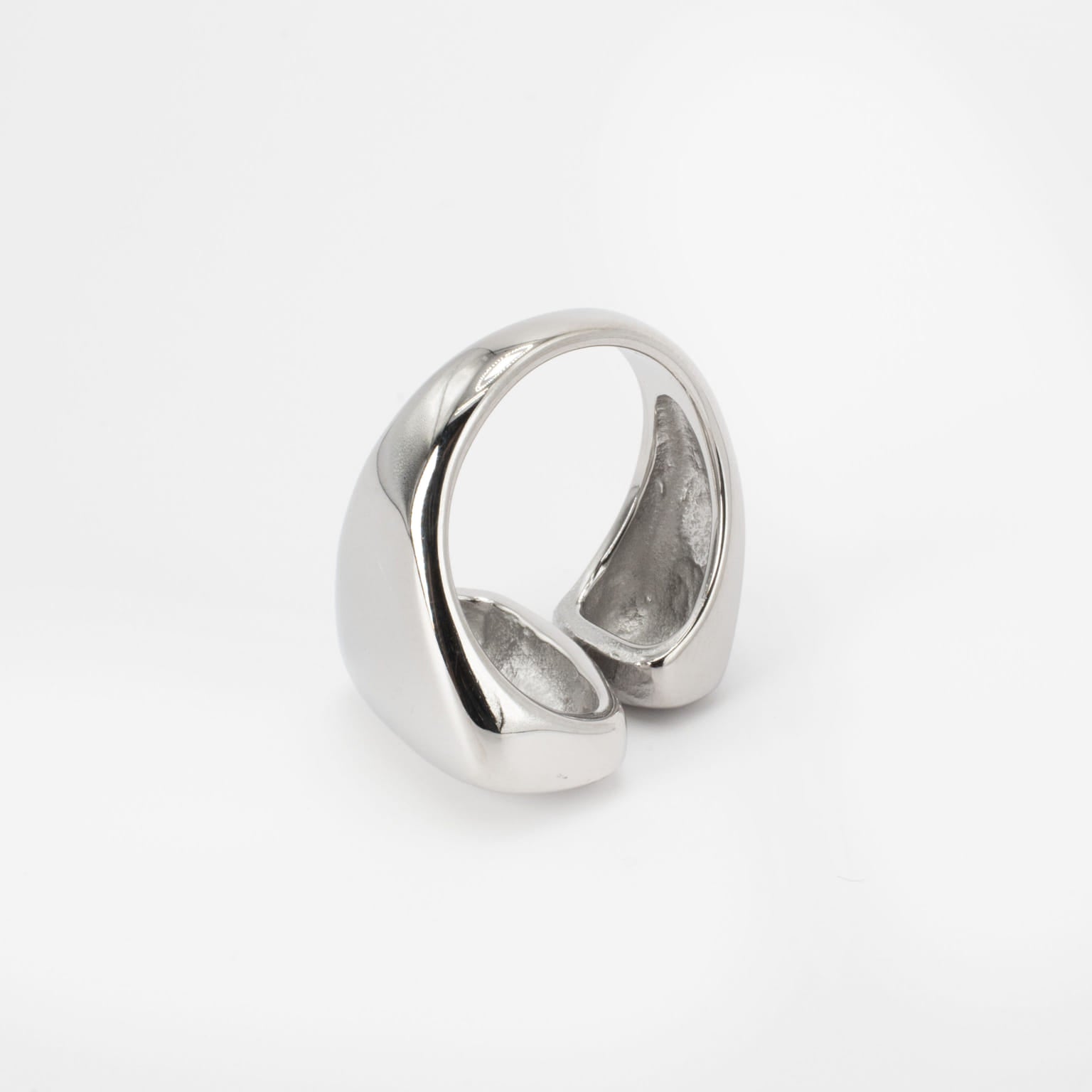 The design features a modern pass ring silhouette, distinguished by its open, airy form and fluid lines. Its wide band creates a bold yet elegant impression, perfect for accentuating the hand without overpowering. Two prominent curves subtly mirror each other, invoking movement and sophistication in a minimalist frame.