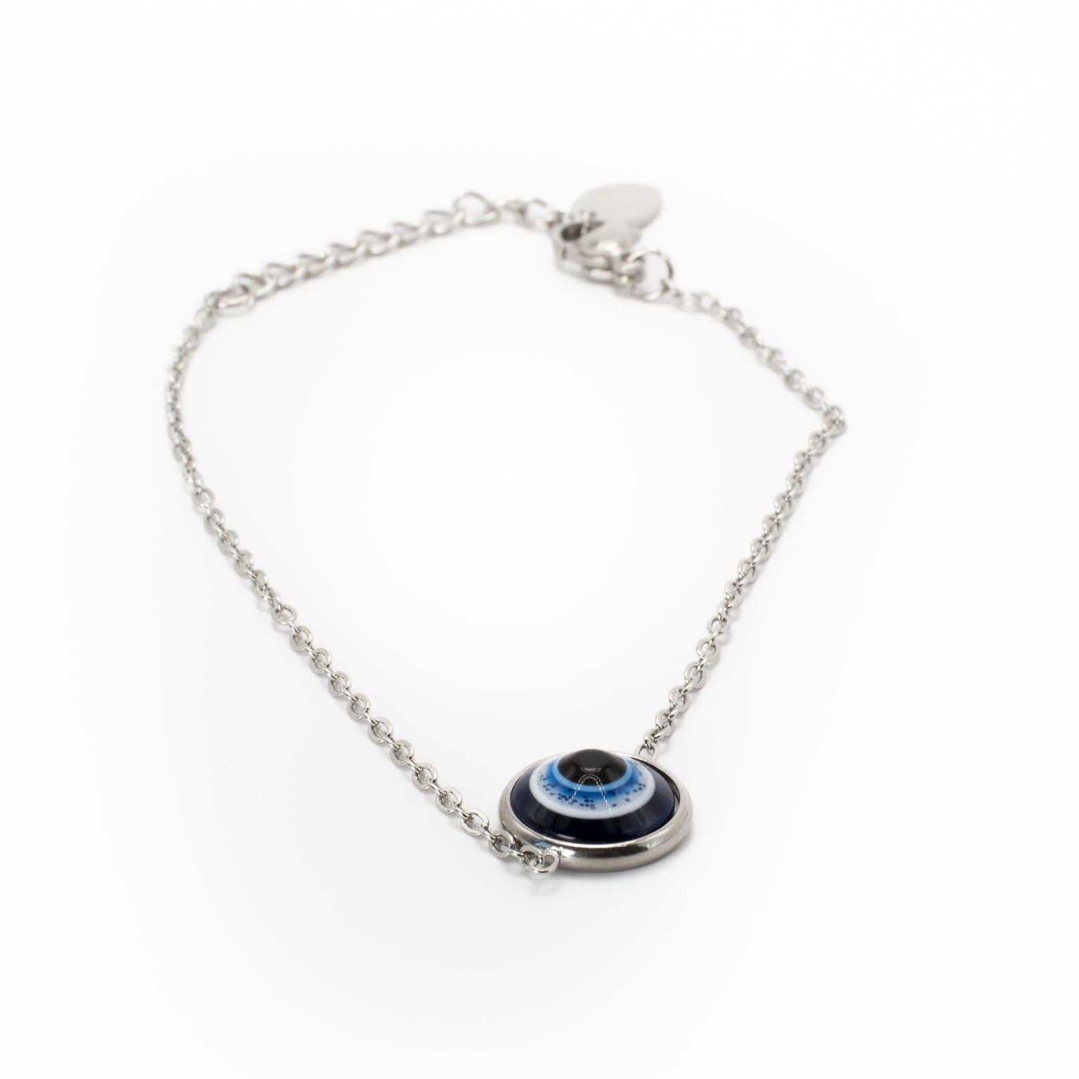 Design: The bracelet features a sleek, adjustable chain with a circular "evil eye" pendant in vibrant blue and white hues, creating a striking contrast against the silver.