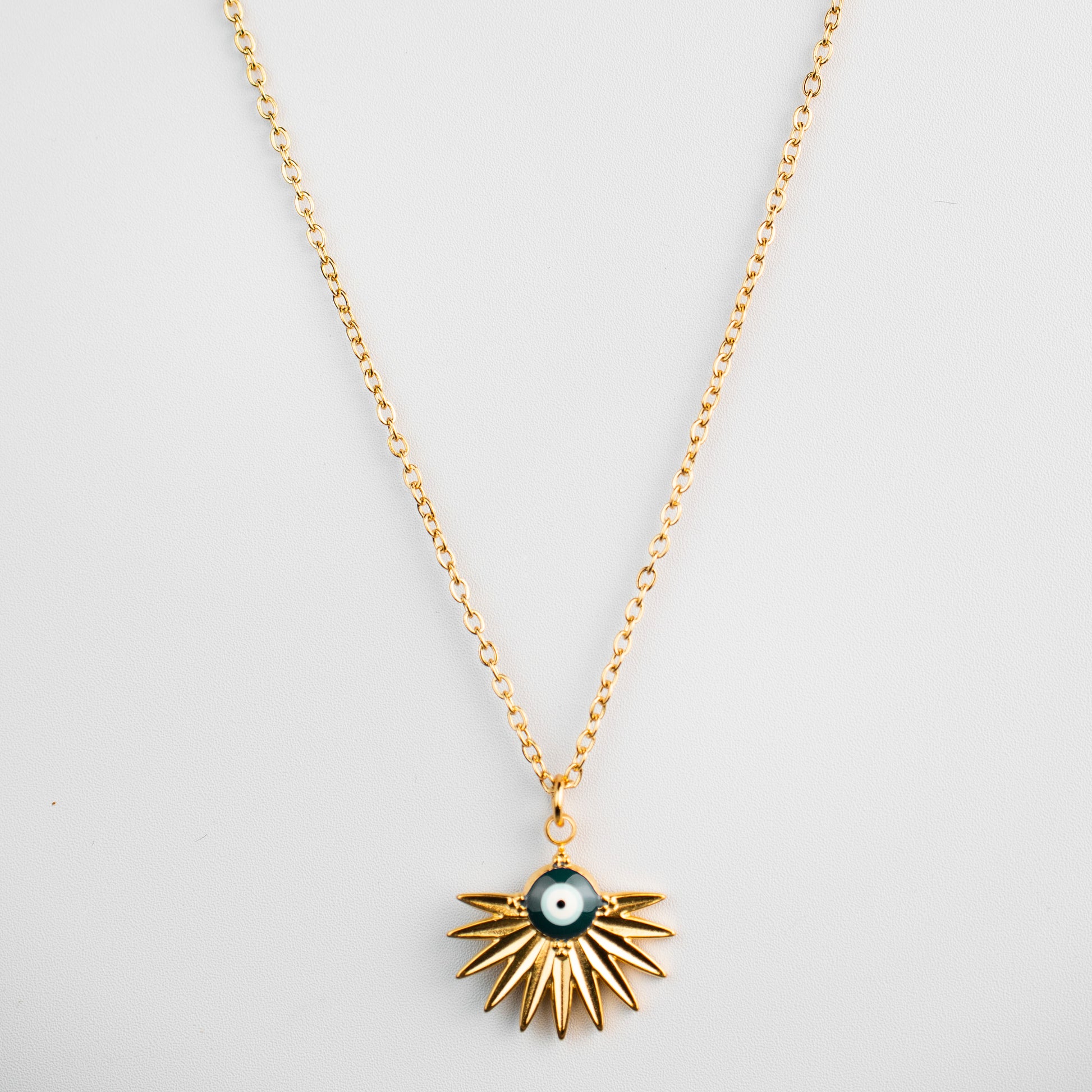 A luminous 18K gold-plated necklace featuring a bold sunburst pendant with an eye motif at its center, symbolizing protection and clarity. This piece merges cosmic allure with spiritual meaning, ma...