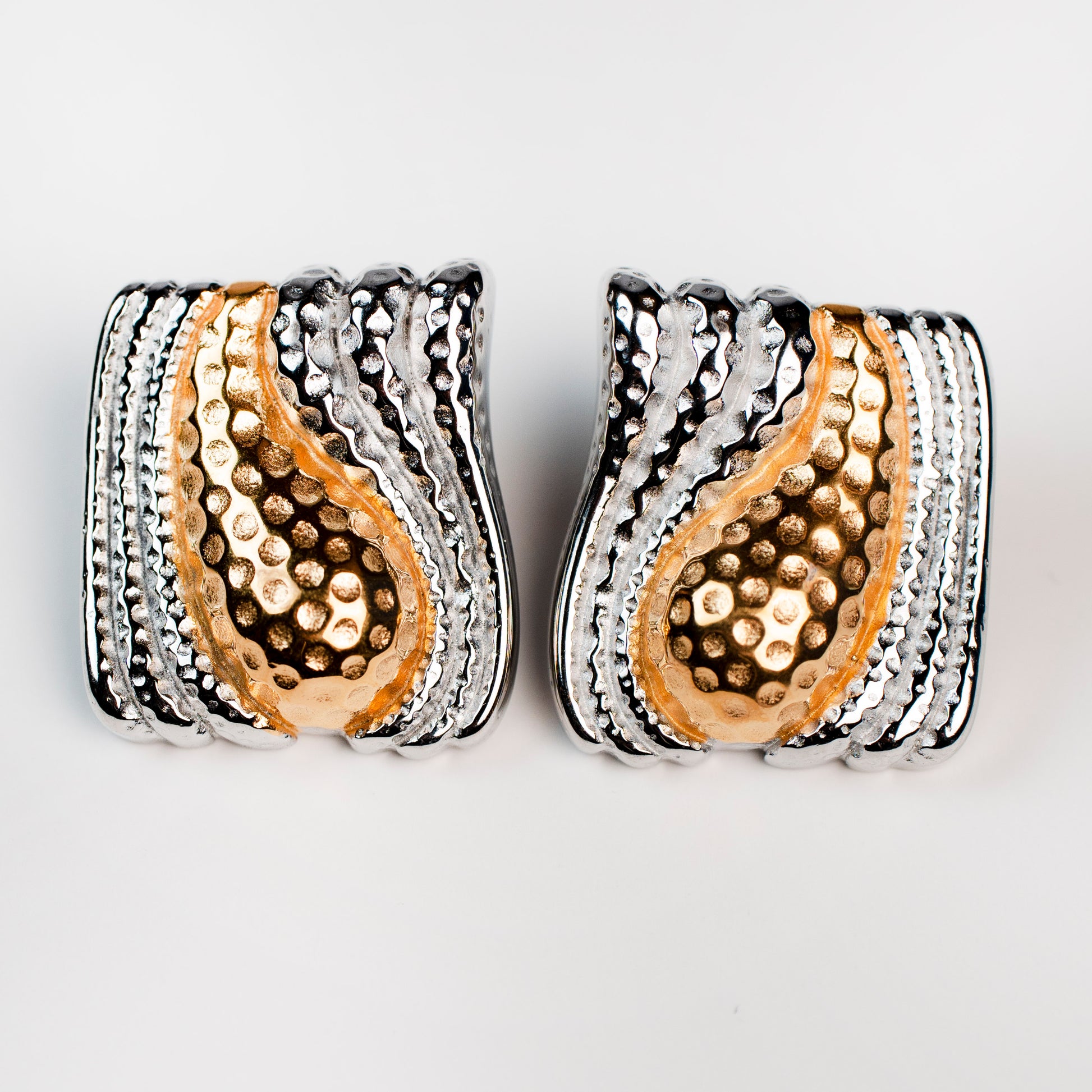 The Silver Crest hammered frame earring modern refinement with enduring elegance, featuring a sleek stainless-steel base accented with an 18K gold PVD finish. Their fluid shape and polished surface...