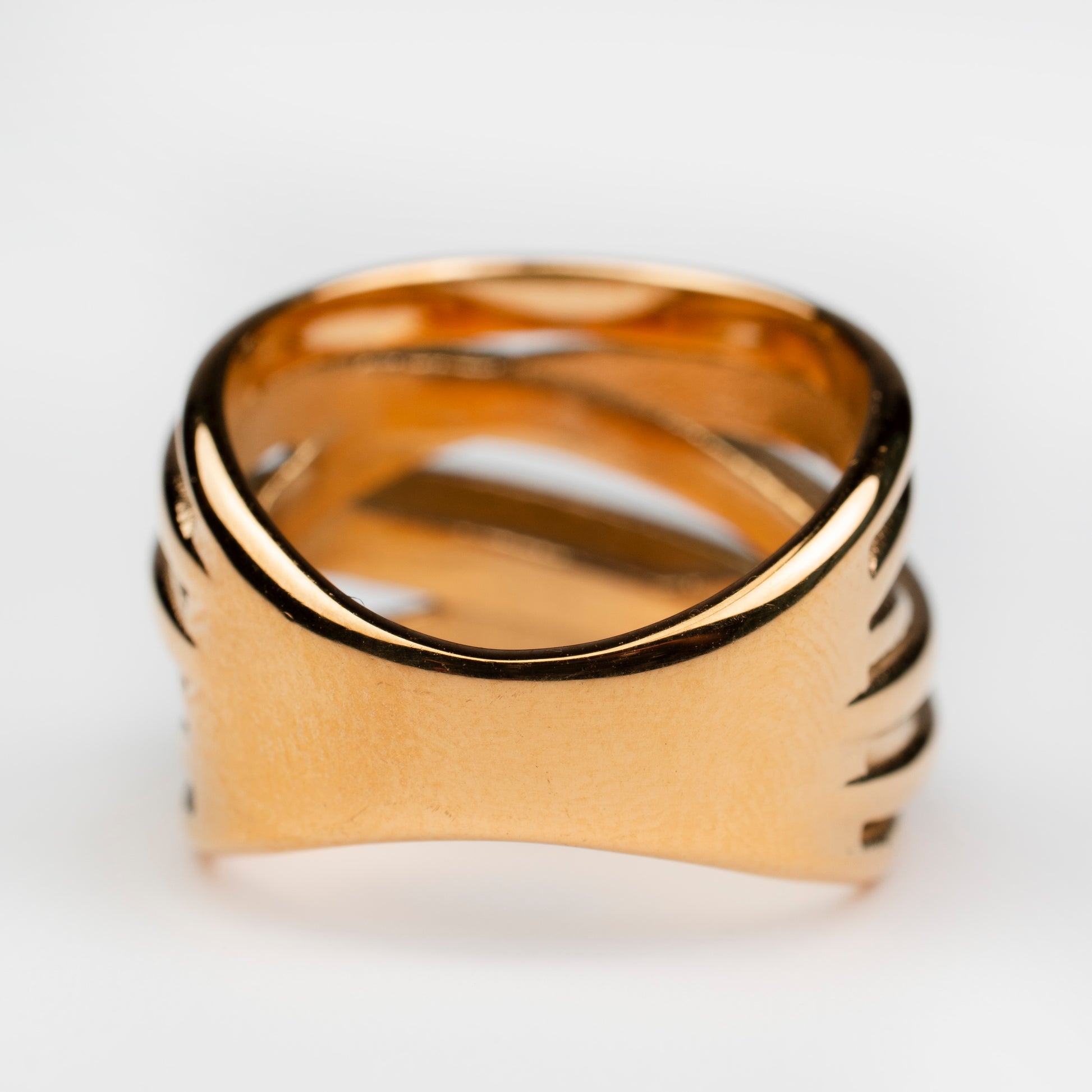 A bold yet refined statement display of interwoven gold-plated bands that create a fluid sculptural design. Its polished finish gives it a radiant and luxurious appearance, perfect for modern styli...