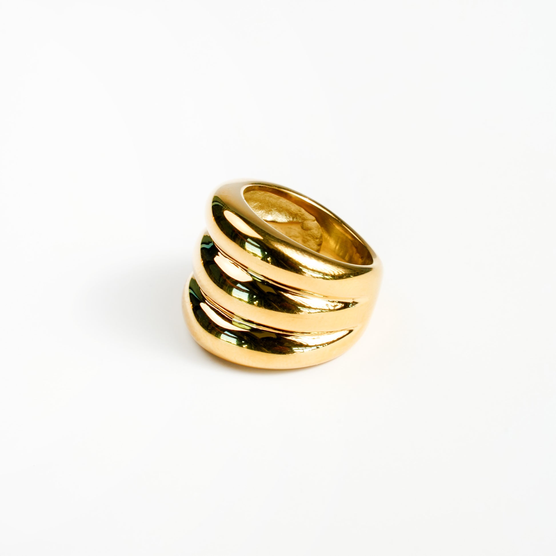 This striking ring features three bold layered unifying intoone band of stainless steel, 18K PVD gold finishes. Itspolished design highlights depth and modern elegance,making it a timeless statemen...